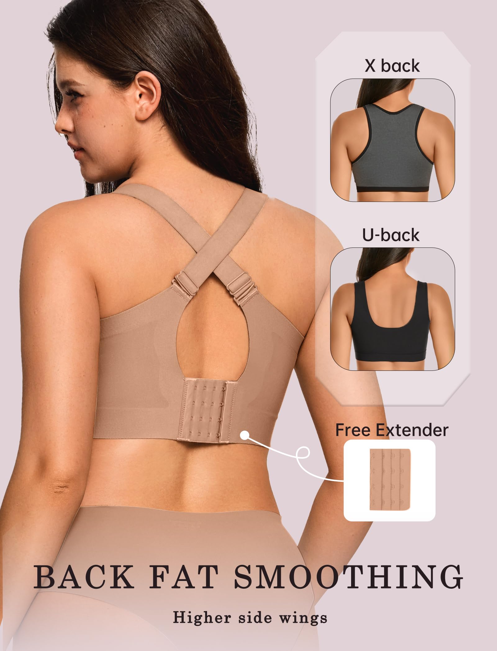 Back-Smoothing Design - This wireless bra combines an innovative widened side wing design with a 5-row, 4-buckle back closure (plus free extender) for adjustable support. Its U-shaped back and widened side wings seamlessly smooth back fat and underarm bulges. The high side ratio design securely wraps fuller busts to prevent side spillage, and the semi-fixed padding stays perfectly in place during both wear and washing for effortless comfort.