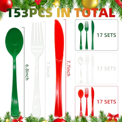 【Sufficient Quantity】:This set of Christmas cutlery sets includes 17 sets red plastic silverware, 17 sets green plastic silverware, 17 sets white plastic silverware, can serves 51 guests at the same time. No need to worry about insufficient cutlery, one-time preparation, perfect match for your Christmas party needs.