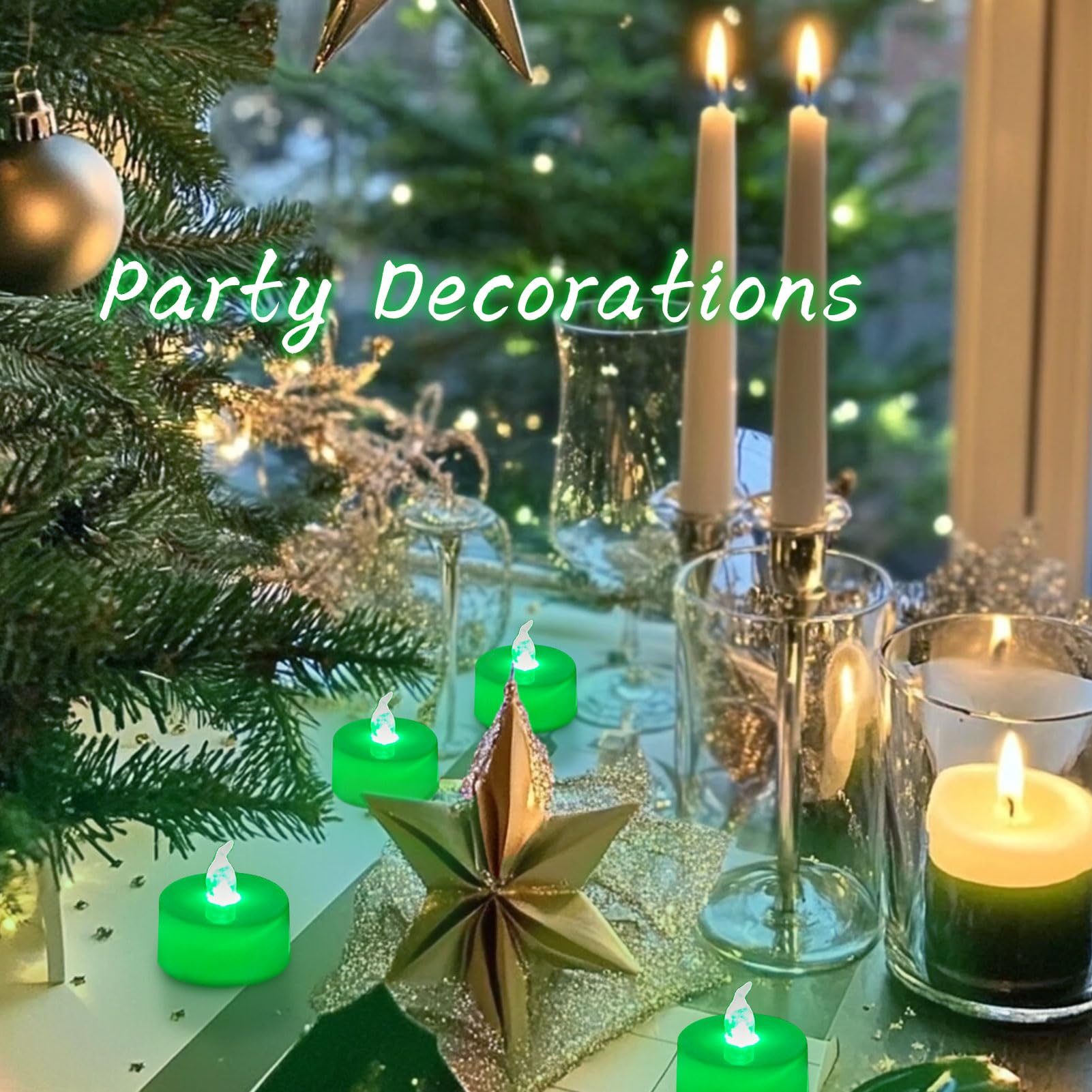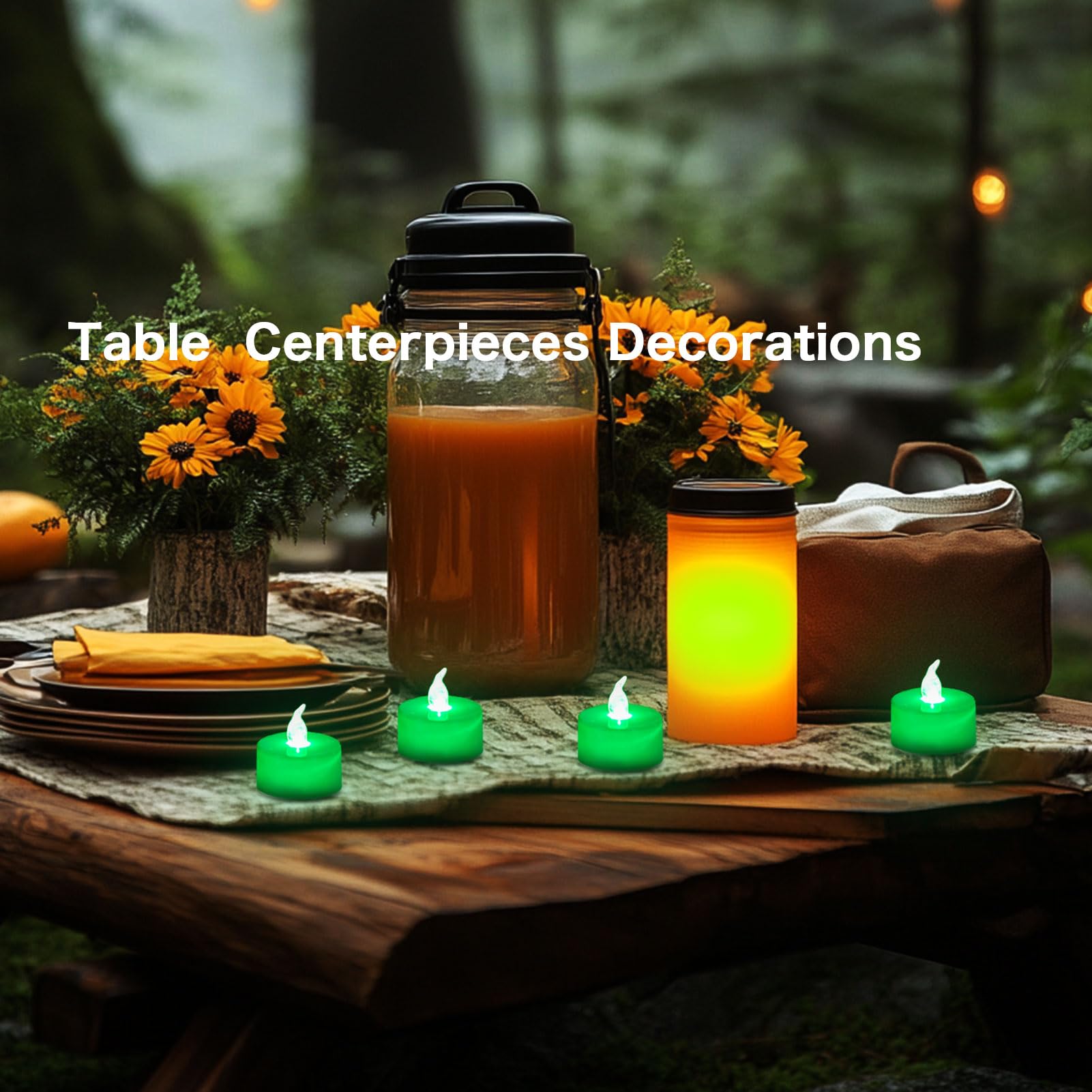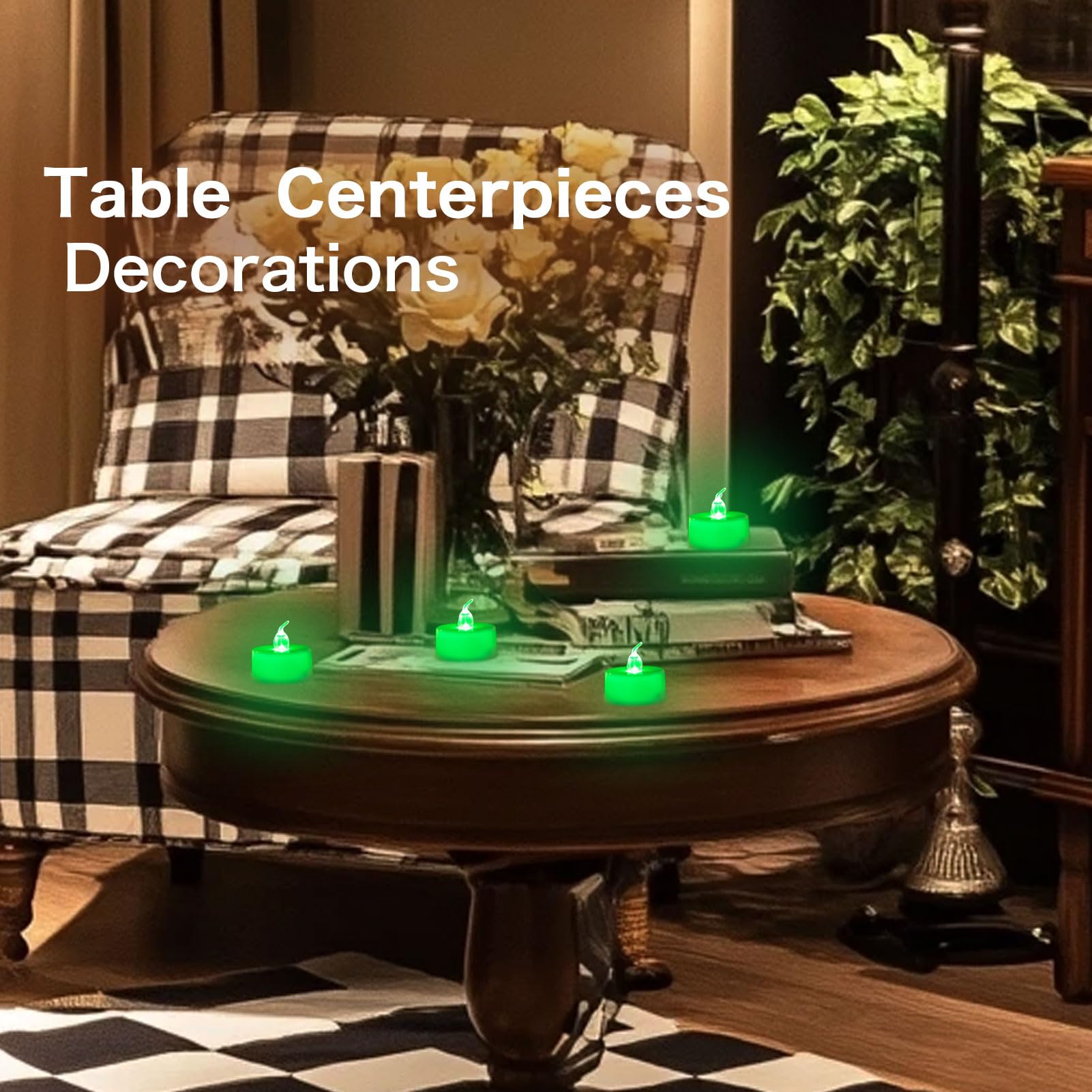 LED Tealight Candles: This pack includes 24 flameless LED tealight candles that emit a romantic green glow, perfect for creating a cozy ambiance.