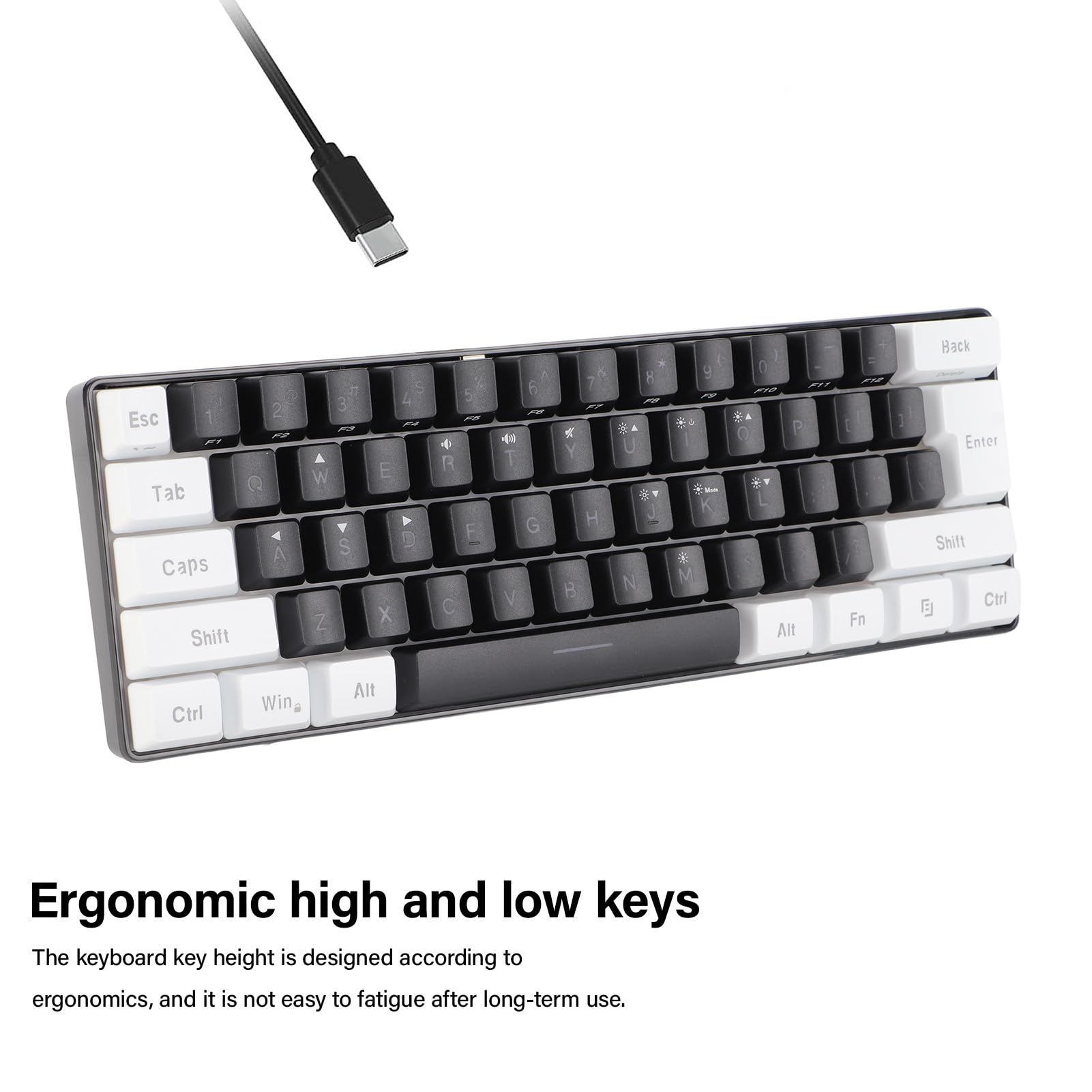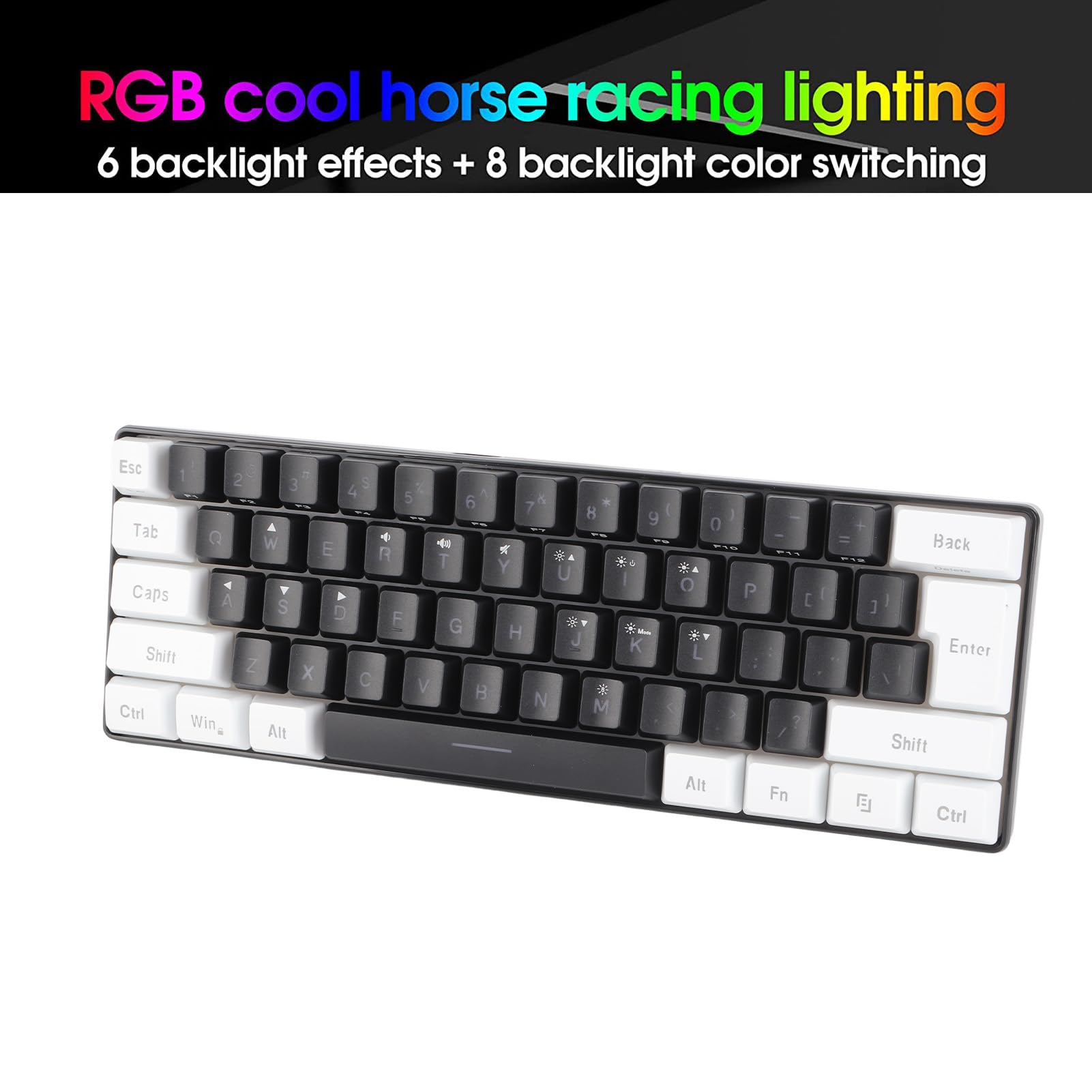 1. MULTIPLE RGB MODES: The Mini RGB keyboard offers multiple RGB modes and LED backlighting, you can customize the brightness and respiration rate according to your preference, and the backlighting makes typing at night more enjoyable. 2. ERGONOMIC DESIGN: The gaming keyboard is ergonomically designed with a stand that allows you to adjust the typing angle to keep your hands in the most position to minimize hand fatigue after long hours of use. 3. MECHANICAL FEELING: The Gaming keyboard has a mechanical feel and produces a soft sound with each keystroke to avoid distracting noise, designed for gamers and office workers. 4. WIDE COMPATIBILITY: Wired keyboard is plug and play, no driver or software required, compatible with for 98 NT 2000, for 7 8 10, for OS X and some other systems. 5. TYPE C INTERFACE: RGB keyboard adopts Type C interface with 100mA working current and DC 5V working voltage, it has all the functions of a standard keyboard, saves desktop space, and its compact design makes it more portable for daily use and business trips. Specification: Item Type: Mini RGB Keyboard Material: ABS Size: Approx. 288.5 x 101 x 34mm / 11.36 x 3.9 x 1.3in Number of Keys: 61 Keys Lighting: RGB Interface: Type C Working Current: 100mA Compatible System: For 98 NT 2000, for 7 8 10, for OS X, etc. How to Use: plug and play PackageList: 1 xMini RGB Keyboard 1 x Data Cable 1 x User Manual