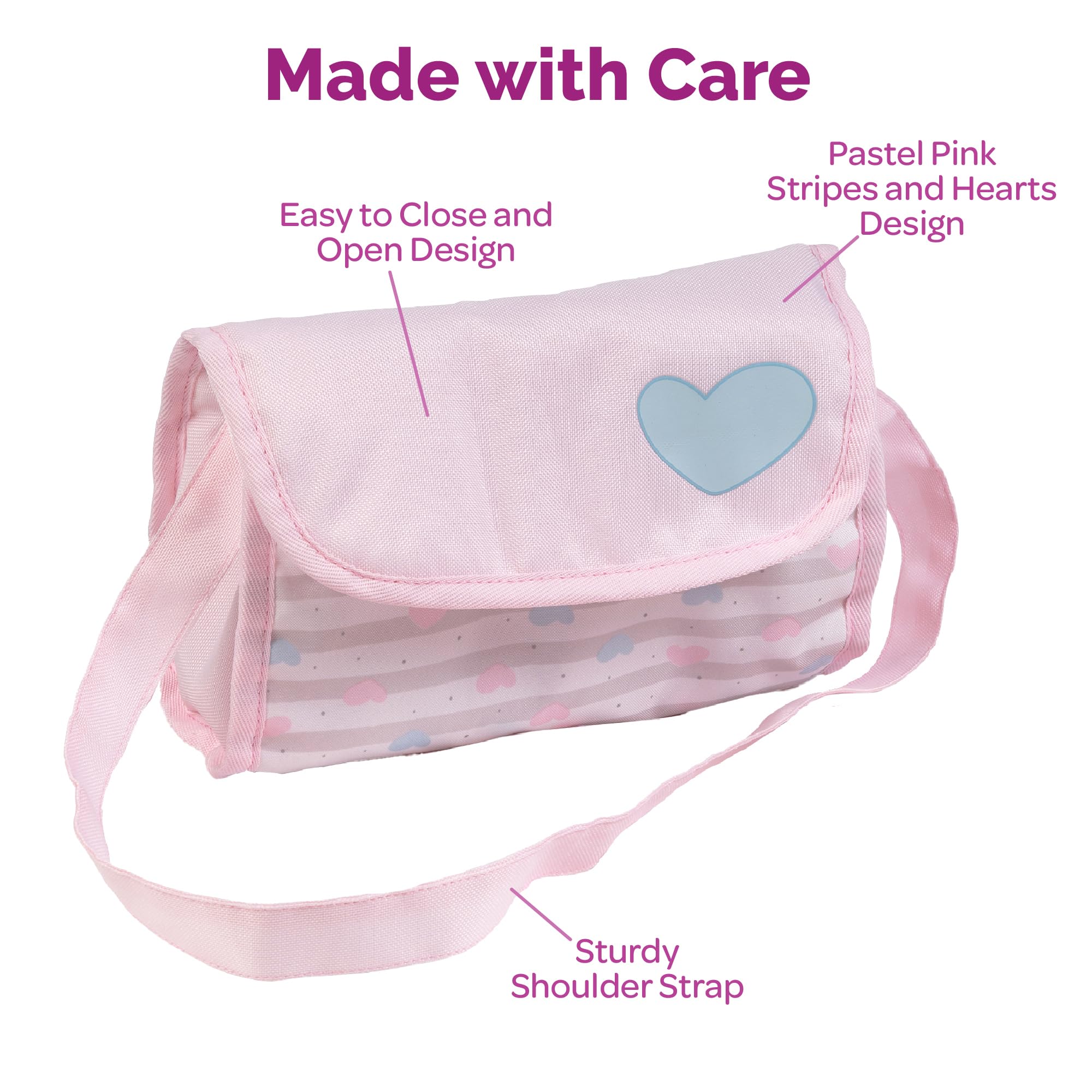 As parents, we understand how hard it is to pull your kids away from the screens and into a world of imaginative play, but that's where we come in! For the past 30 years, Adora has helped parents unplug and play with toys that spark imagination, develop empathy, and inspire creativity. Cue the Adora Classic Pastel Pink Diaper Bag - a stylish and functional accessory for your little ones' dolls! With its eye-catching Classic Pastel Pink print of pink, white & gray, adorned with Adora hearts all over, this diaper bag is the perfect accessory for your little ones' dolls up to 13"" in size.