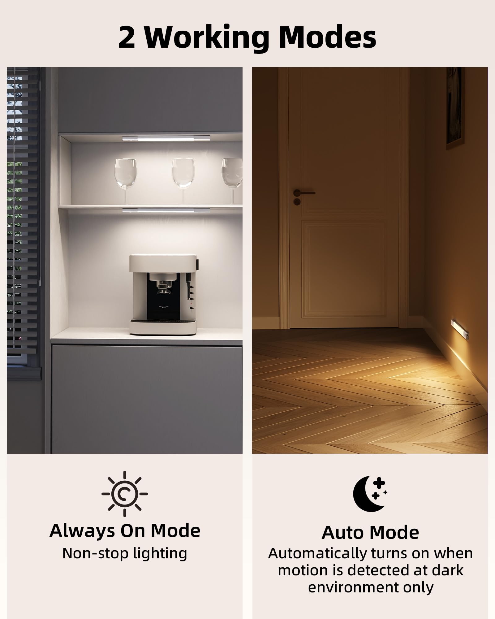 Smart Motion Sensor Light Indoor: EZVALO under cabinet lights automatically turn on in low light when motion is detected within 10 ft (120° sensing angle) and turn off after 20 seconds to save power. Ideal for gentle nighttime guidance in closets, stairs, hallways, or bedside areas—providing just enough light to move around safely without turning on bright overhead lights.