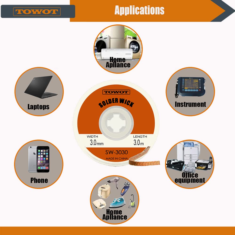 Quality materials:The Braided Desoldering Wicks are made of 100% copper wires with a fine braid design. Using flat stitch weaving, fast heat conduction, to promote strong capillary action to pull in excess solder.