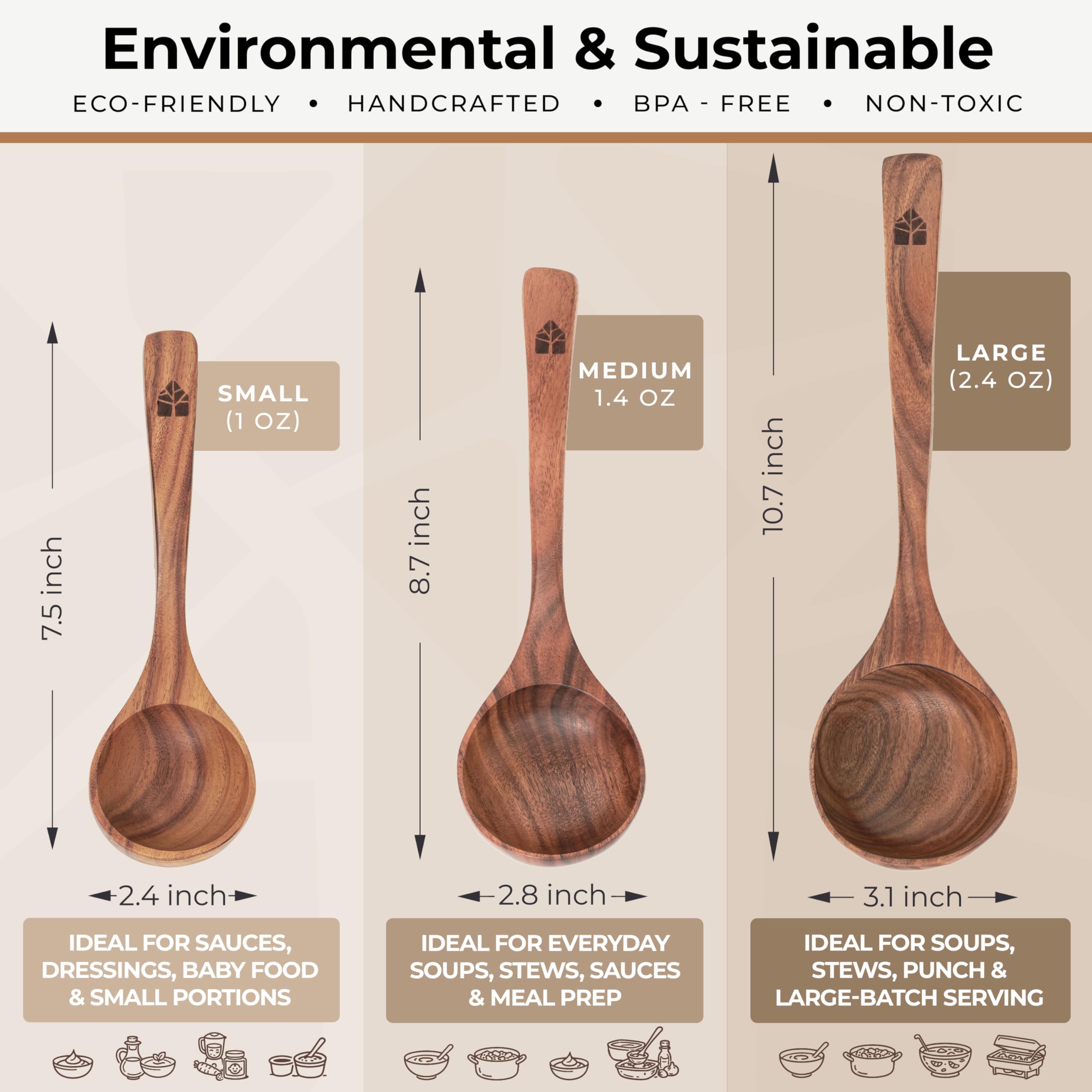 WHAT’S INCLUDED? The only set that includes 3 cooking spoons ladles that meet all your needs. This includes large ladle (10.7 X 3.1 inch), medium ladle (8.7 X 2.8 inch) and small ladle (7.5 X 2.4 inch)
