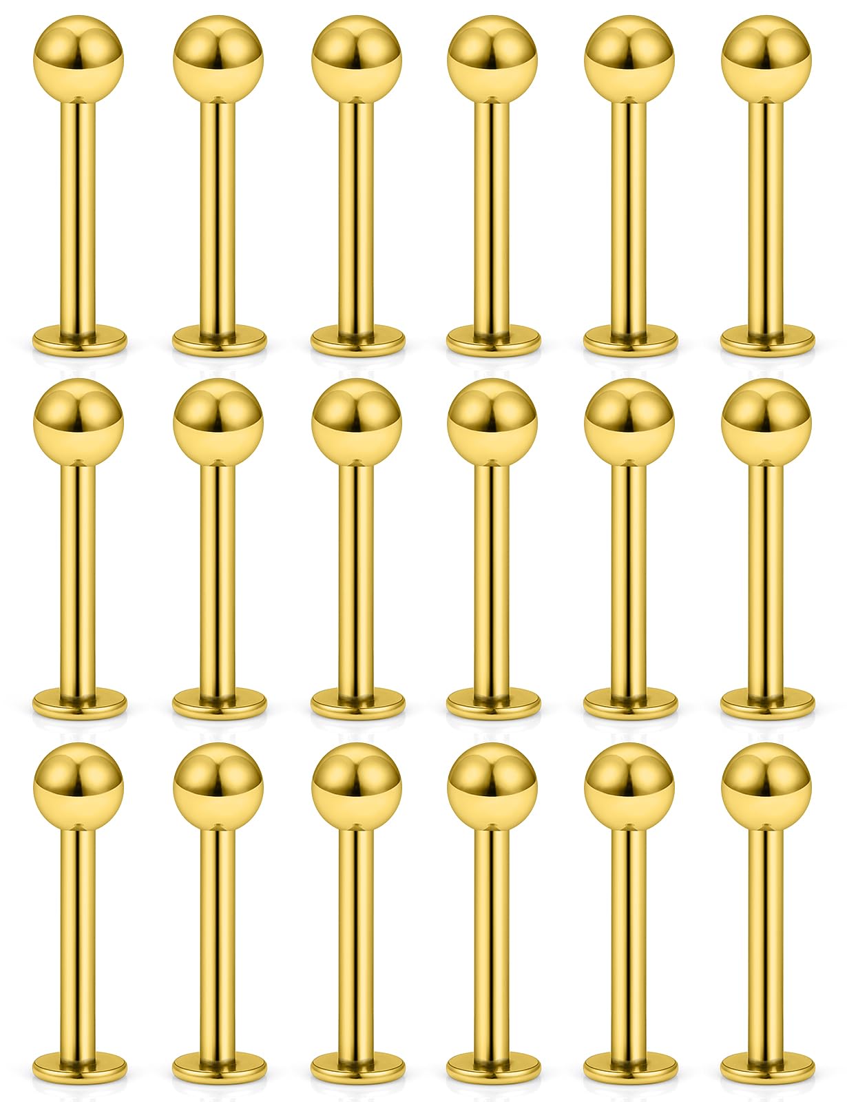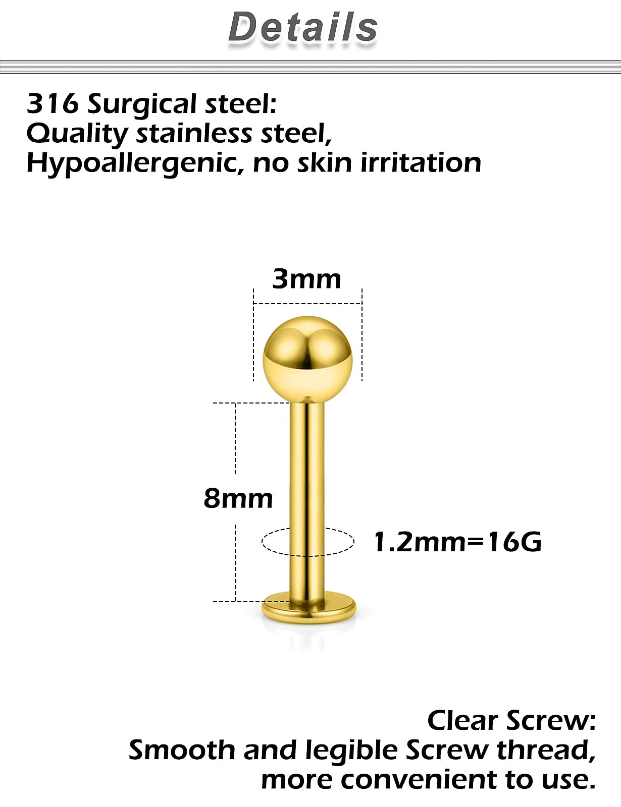 MEASUREMENTS--Lip Rings Studs Gauge Size: 16G (1.2mm); Straight Bar Length: 8mm(5/16 Inch),Top Size:3mm, The Different Sizes Made It Easy to Find the Right One for You. Color: Gold-tone.