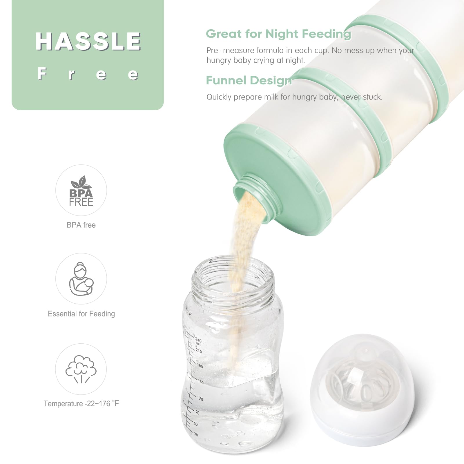 Independent Spout and Stackable Design: Each compartment of the formula dispenser is equipped with independent funnel, they can be freely combined or used separately. Very easy to use and carry.
