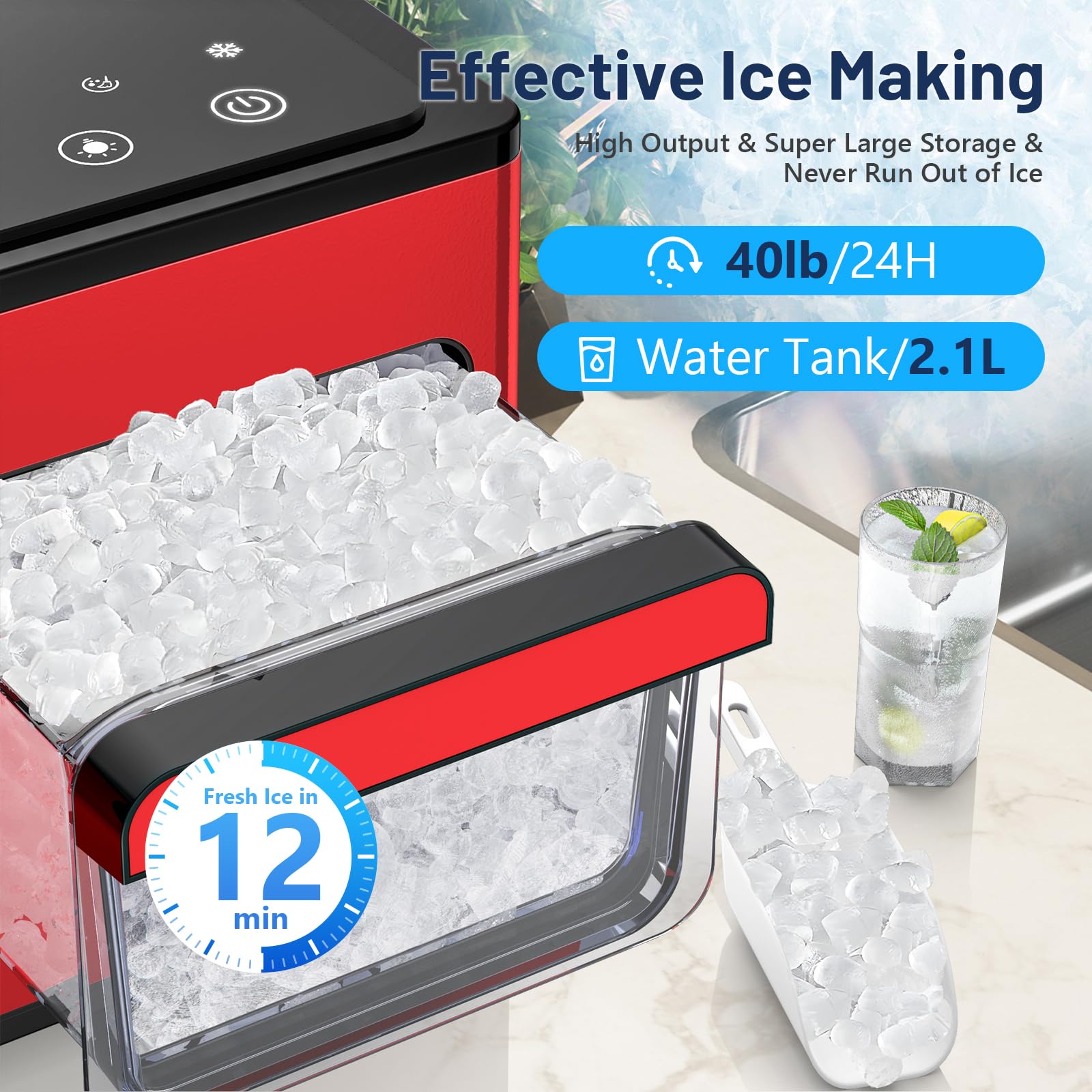Fast & Continuous Nugget Ice Making: Professional compressor plus a 2.1L water tank allows the nugget ice maker to produce up to 40 lbs of ice per day. Perfect for preparing cold drinks for the whole family, or enjoying a cold brew on a quiet morning, easily turn your favorite beverages freezing cold in minutes. Never worry about running out of nugget ice!