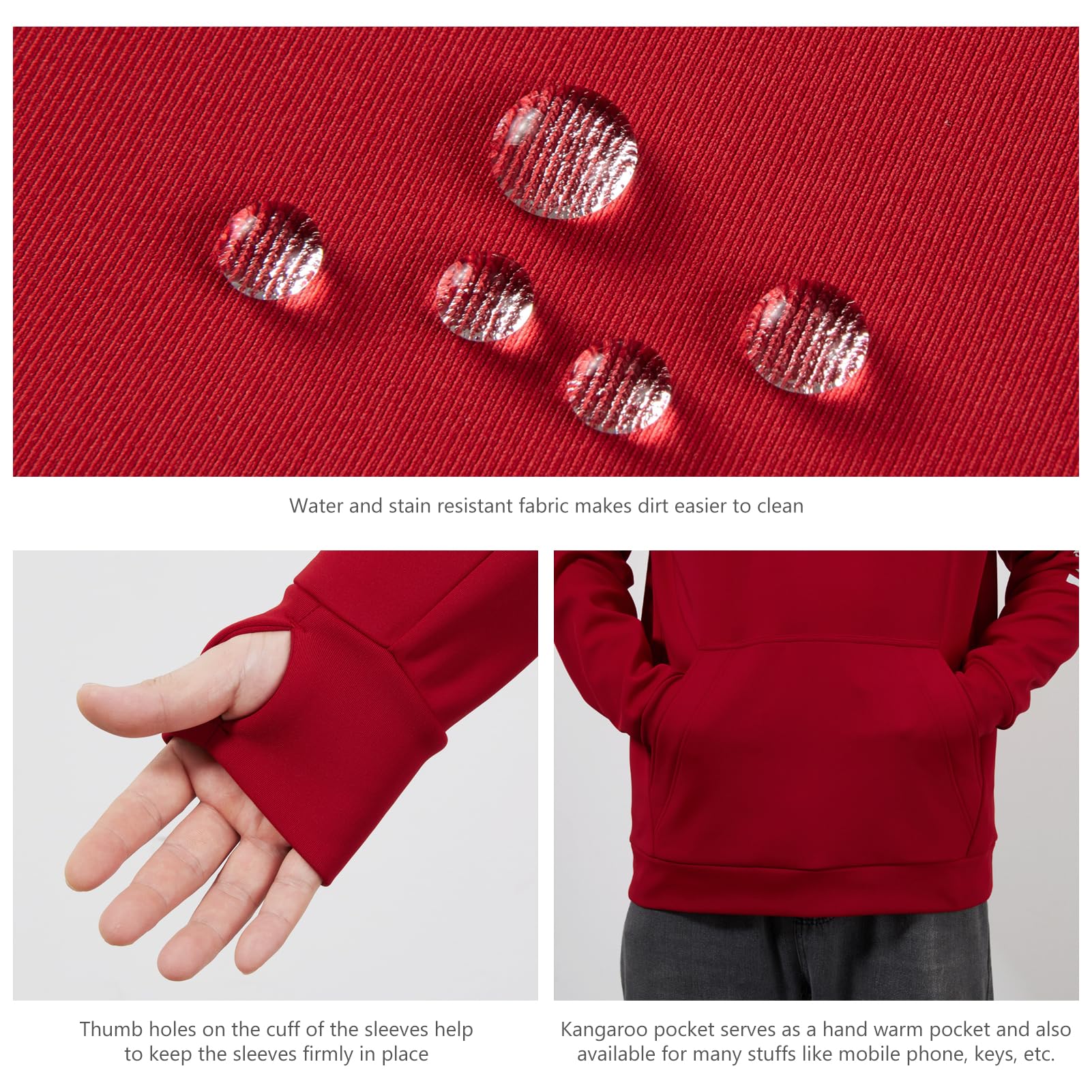 Big kangaroo pocket serves as a hand warm pocket and is also available for personal stuffs like mobile phone, keys, etc; Thumb holes on the sleeve cuffs help to keep the sleeves firmly in place