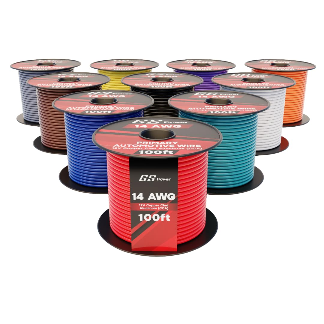 Primary automotive wire assortment: 14 AWG wire x 10 rolls, 14Ga wire in 100ft spool total of 1000ft. This electrical wire comes conveniently in spool rolls. Red, Black, Blue, Yellow, White, Green, Purple, Grey, Orange, Brown. Speaker wire 14 gauge.
