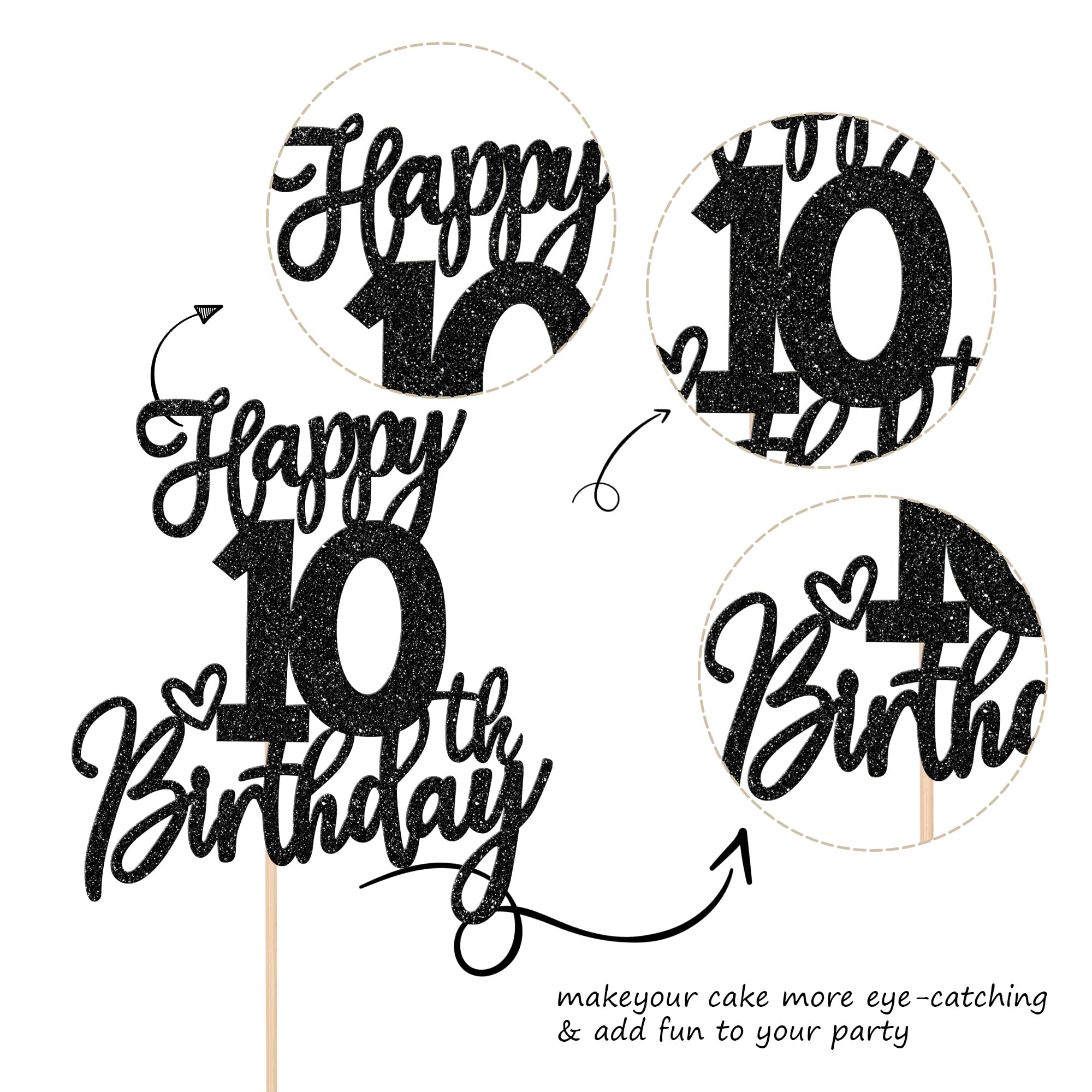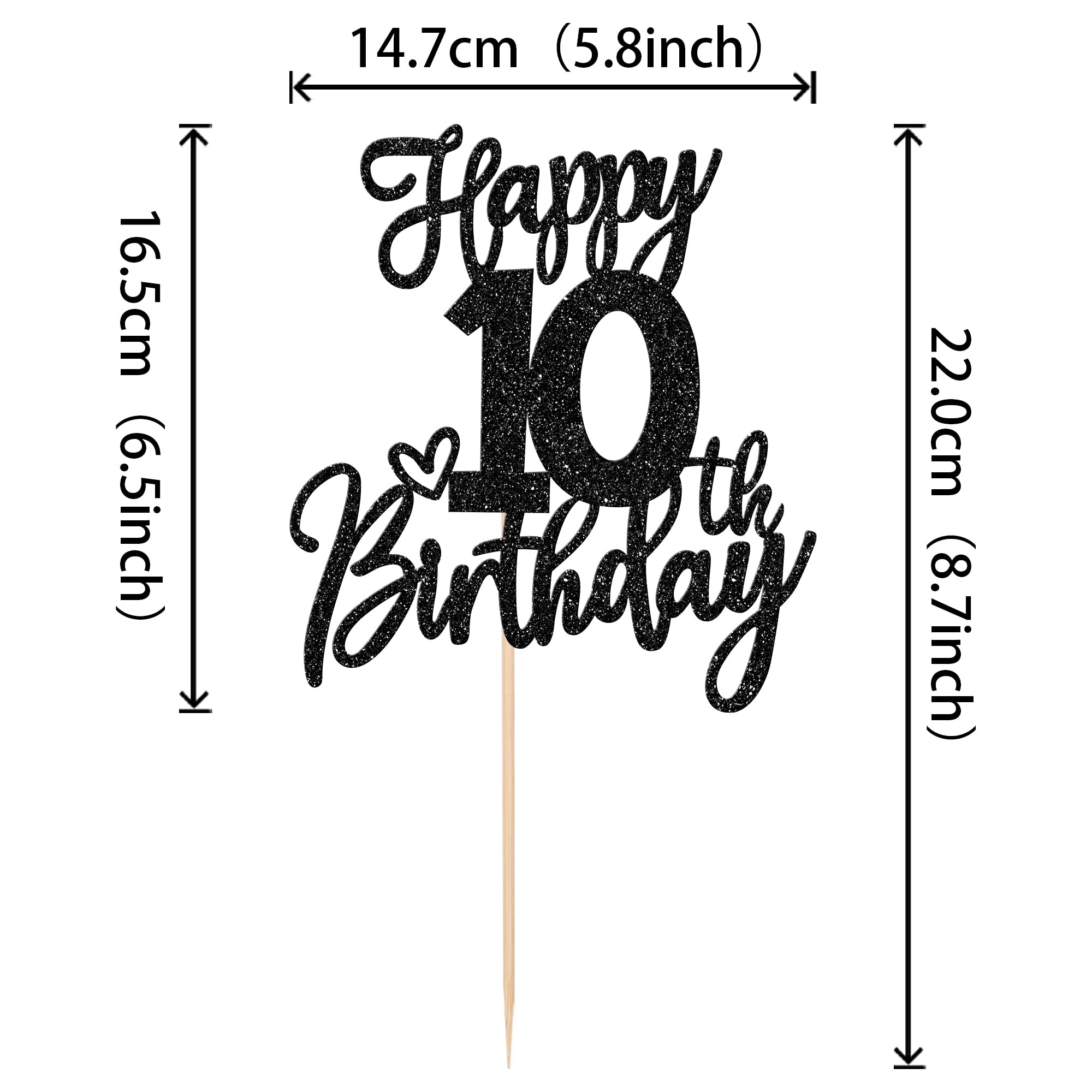 Happy 10th Birthday Cake Topper for Happy 10th Birthday Anniversary Theme Party Cake Decorations Supplies Perfect for happy 10th birthday theme party, cheers to 10 years party,10th wedding anniversary theme party, cheers to 10 years theme party cake decorations supplies. Pack of 1 pcs. The size is W 5.8 inch * H 8.7 inch / W 14.7 cm * H 22 cm ( with stick ) Made of high quality paper card stock and food grade sticks,thick and sturdy. This cake topper is one side glitter, another side is white, and this is intended for decoration only, please do not put them in oven or microwave. If the item you received has any defects, please contact us for refund.we will deal with it within 24 hours.
