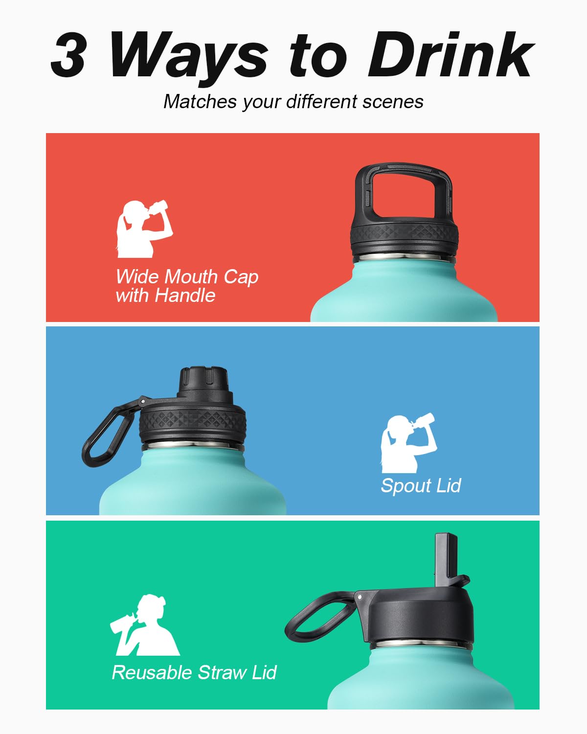 Flexible Drinking On-the-Go: This half gallon water jug comes with 3 different lids. The screw-on lid with flip-up handle is for easy ice refilling with superior portability; spout lid makes it convenient to drink hot liquid and straw lid for sipping cold.