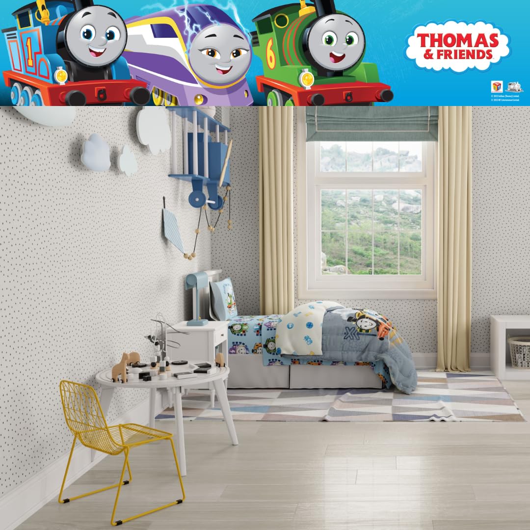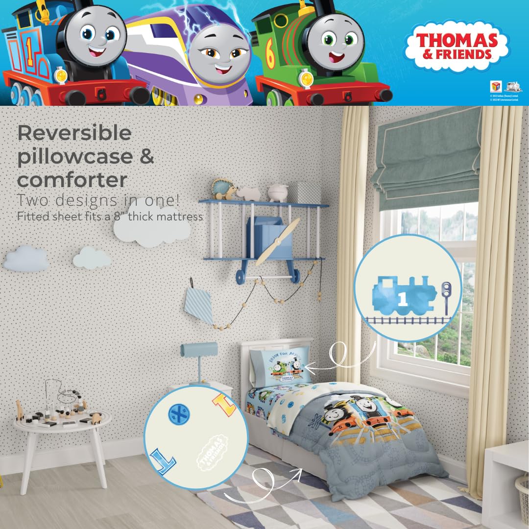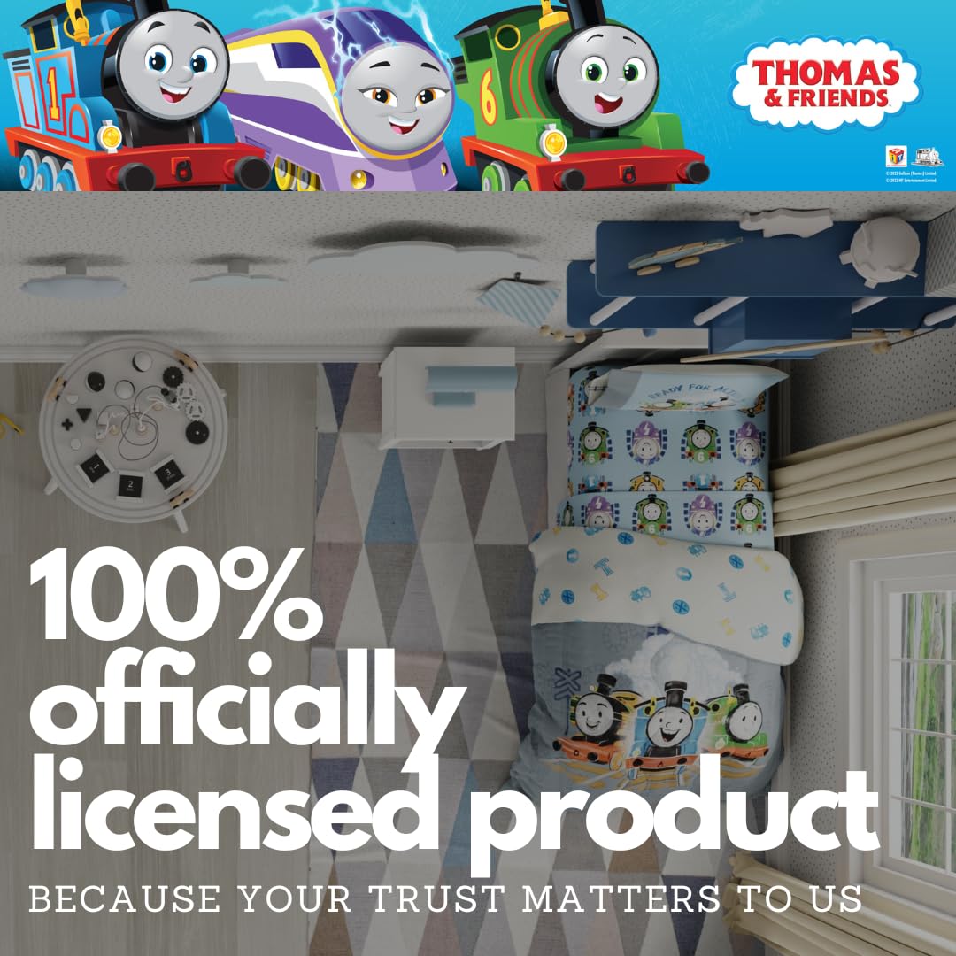 REVERSIBLE COMFORTER FOR DOUBLE THE EXCITEMENT: The reversible comforter offers two cheerful looks: one side features Thomas, Percy, and Nia with steam clouds and track details; the other shows a playful toss of railway-themed icons. A perfect way to change up the vibe with a quick flip.