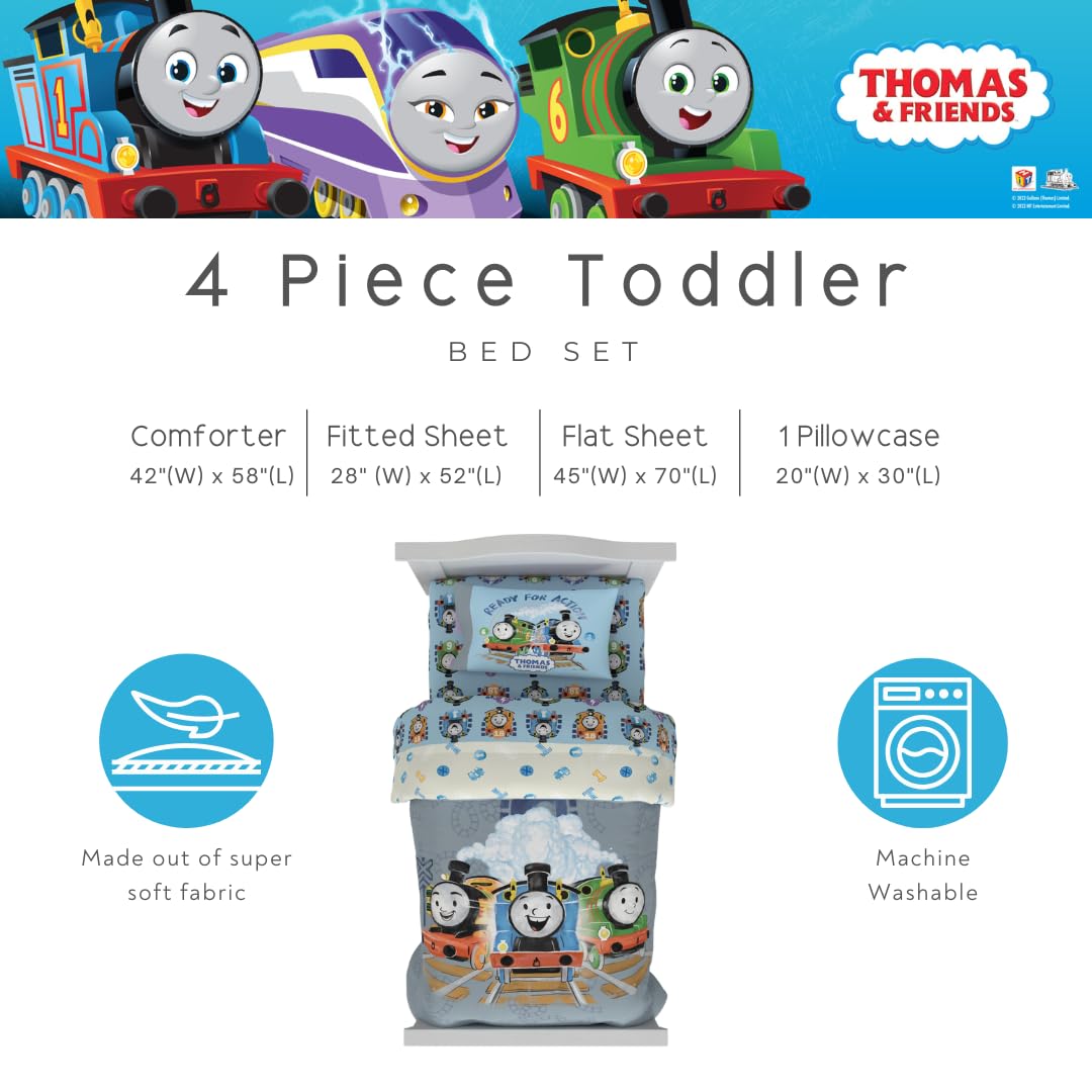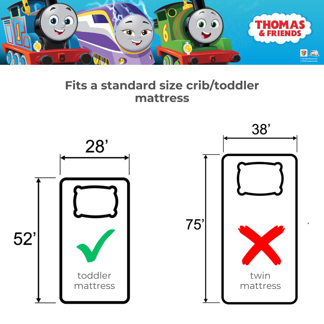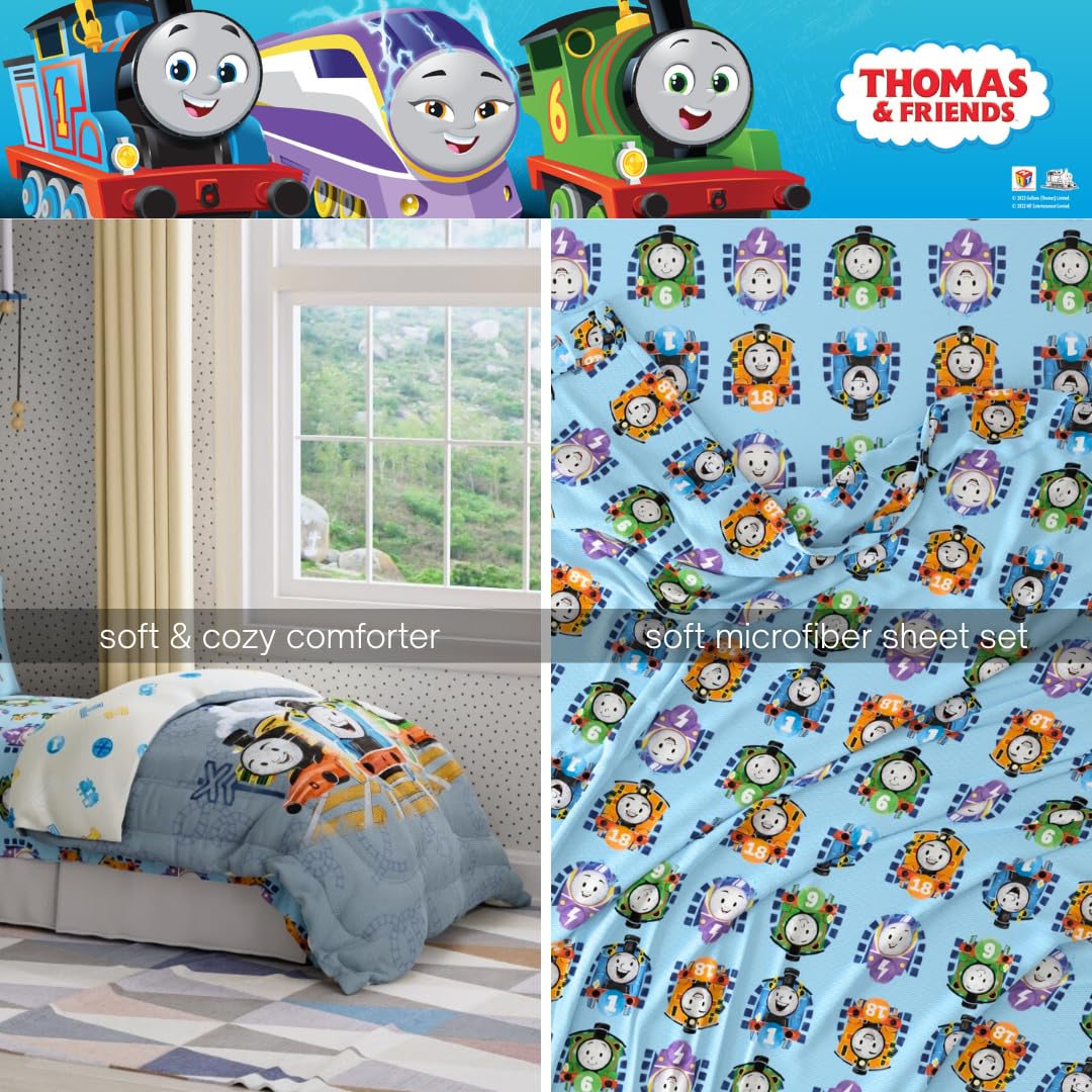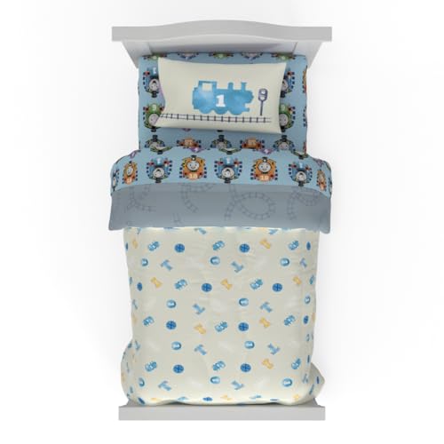REVERSIBLE COMFORTER FOR DOUBLE THE EXCITEMENT: The reversible comforter offers two cheerful looks: one side features Thomas, Percy, and Nia with steam clouds and track details; the other shows a playful toss of railway-themed icons. A perfect way to change up the vibe with a quick flip.