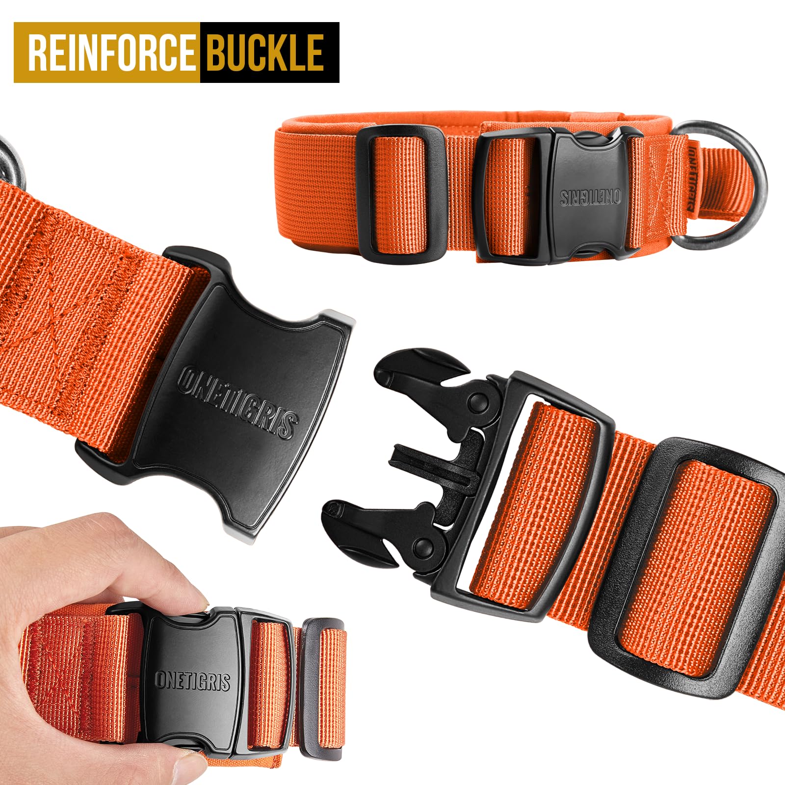 【Double Security】--Integrated collar button design for military training dog collar, one button to unlock, it’s easy to put on and take off, metal buckle is adjustable, you can change the length of collar based on your dog’s neck size