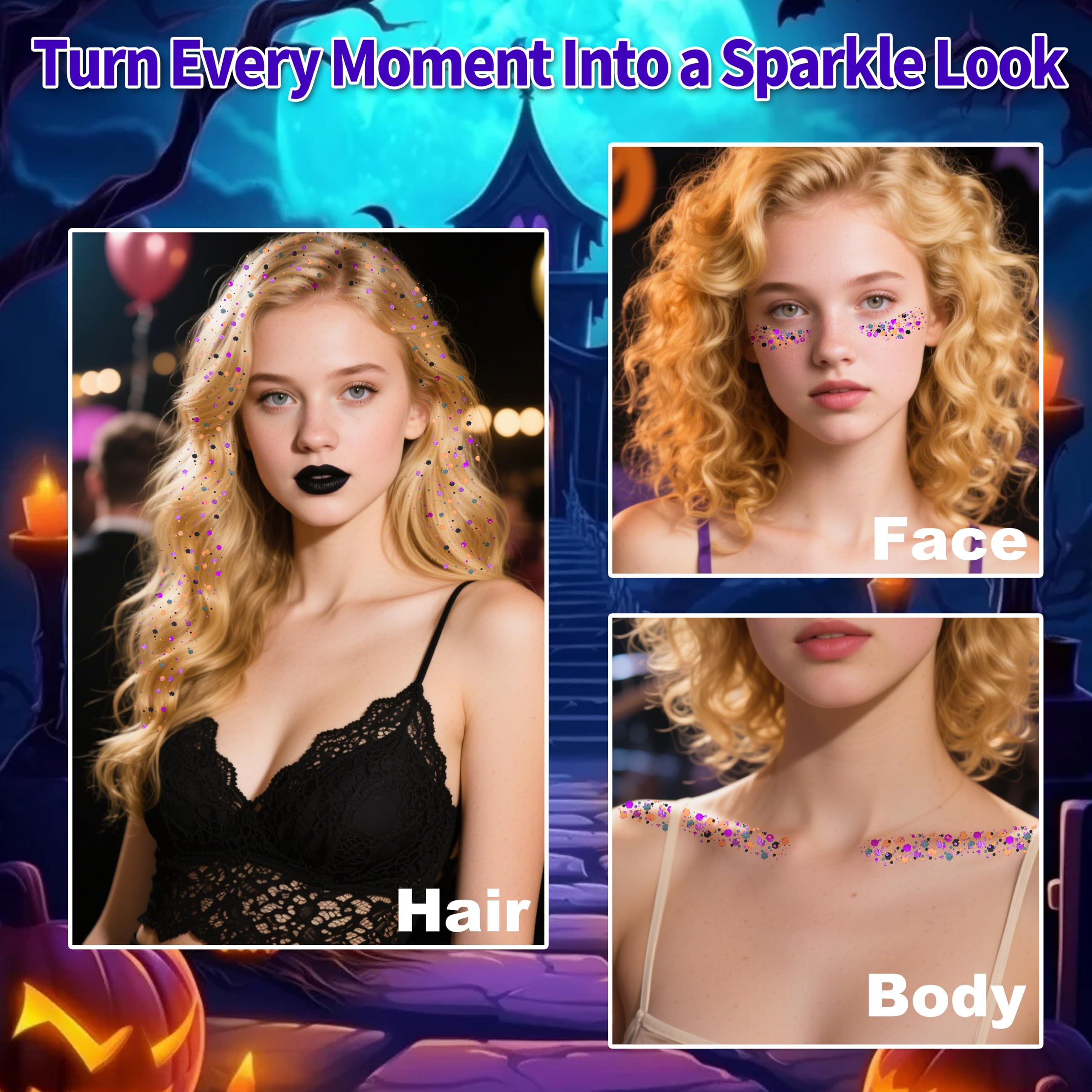 Long-Lasting Wear: Enjoy all-day or all-night glamour with this black orange purple body glitter that stays put, resisting smudges and fading even through dancing or heat. It locks in place for hours, ensuring your look remains vibrant and flawless from start to finish,great Halloween accessories for Women.