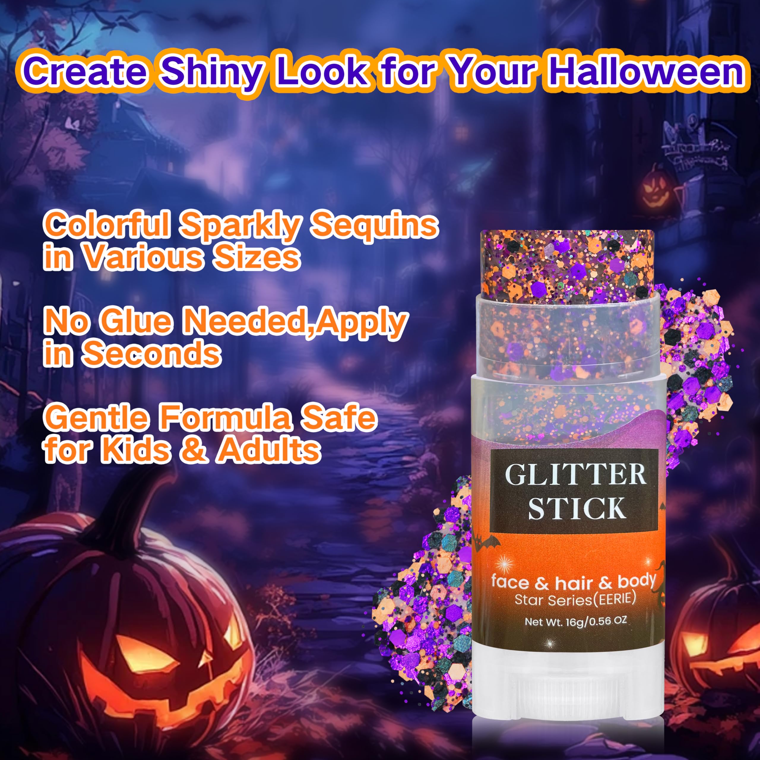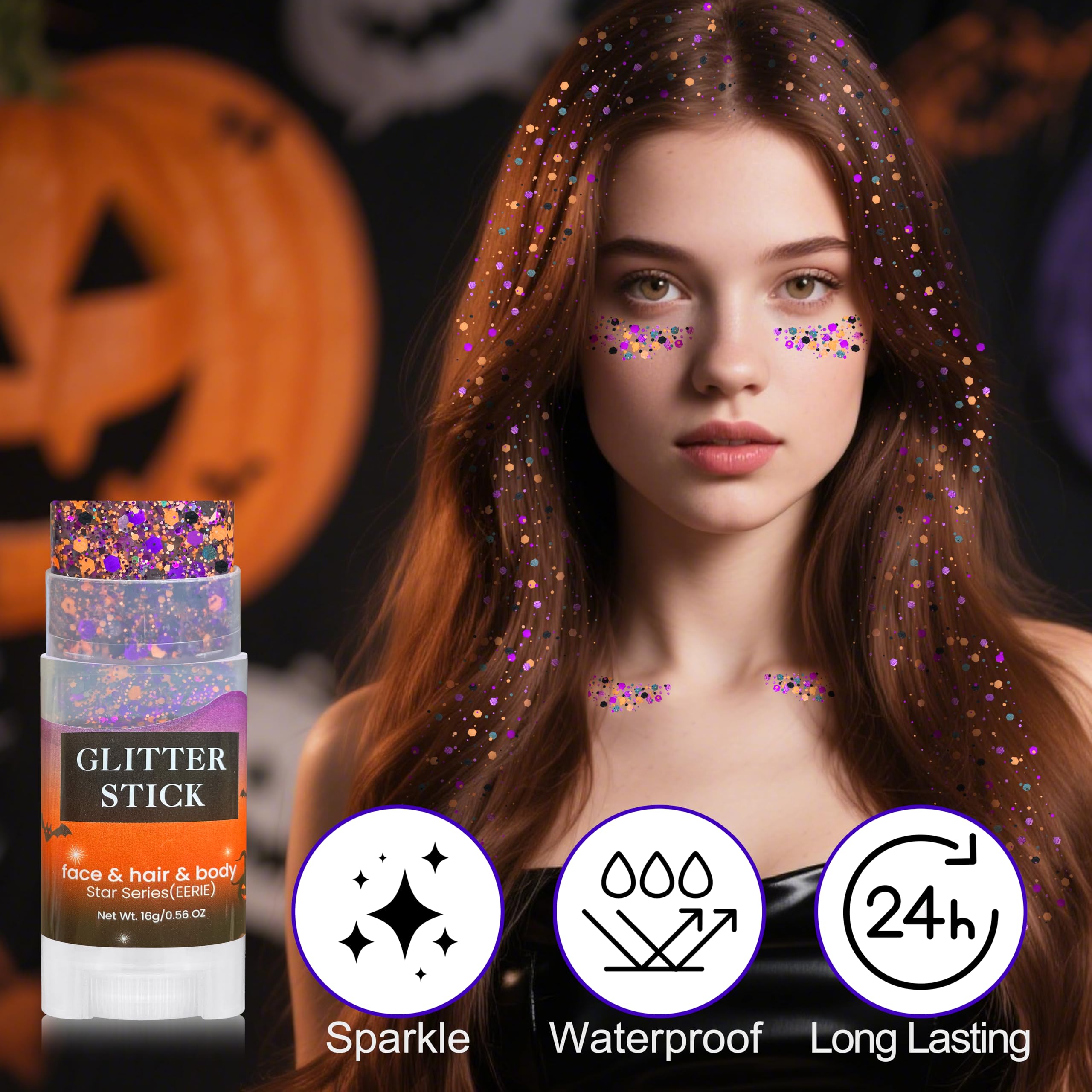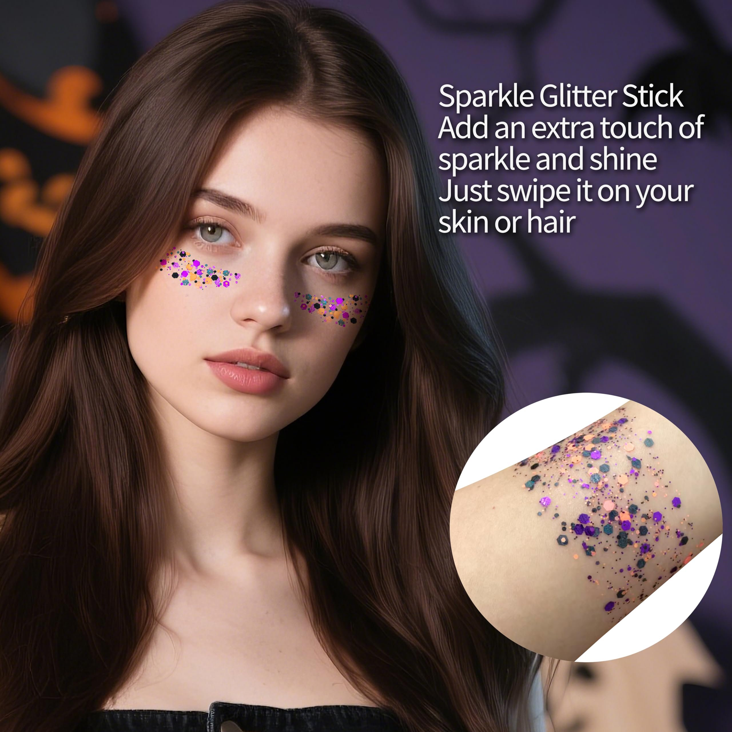 Effortless Application and Removal: Apply this Black Orange and Purple hair glitter stick smoothly and quickly without any messβno glue required! It adheres directly to skin or hair, and removes cleanly with remover cream. Perfect for quick touch-ups or spontaneous fun.This glitter can be used for face,body, hair and eyes,providing you with super sparkle glitter look instantly.