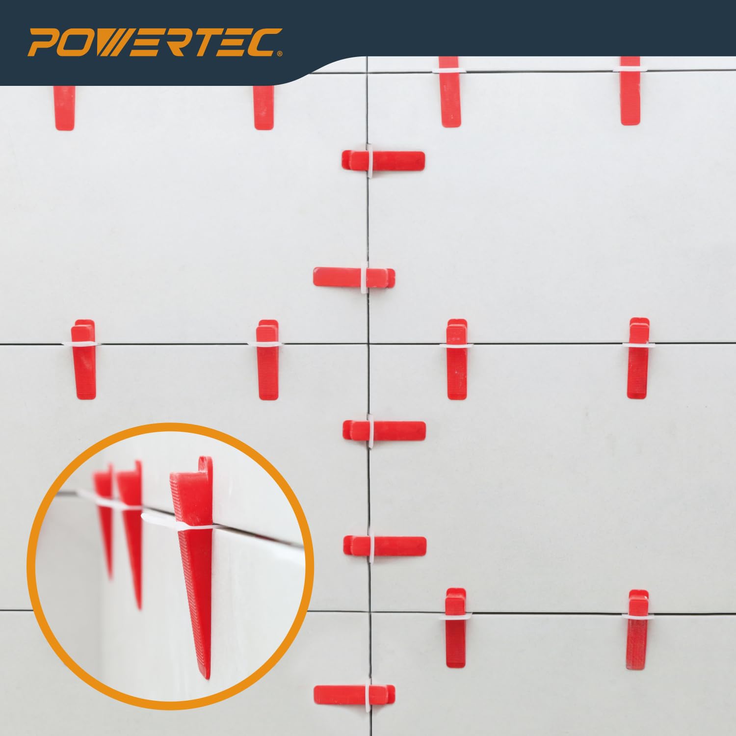 Introducing the Tile Leveling System Reusable Tile Wedges (300pc Set) by POWERTEC. If you are frustrated by uneven tile that ruin the look of your kitchen refreshes or bathroom floor, now you can achieve professional-looking results with these Reusable Tile Leveling System Wedges. Tile leveling system is intended for contractors and DIYers alike, these wedges ensure a perfectly level installation with porcelain, ceramic, marble, large format tile, and more. Say goodbye to lippage and create a seamless, consistent surface that will impress. Stop struggling to level tile manually and save time with these easy-to-use wedges. Designed to work with various sized spacer clips, they give you the flexibility to create a custom look. These wedges significantly speed up installation time, especially when working with those tricky large format tile. Invest in a reusable solution that will pay for itself. Crafted from high-impact polypropylene plastic, these wedges are built to last through multiple projects - a cost-effective choice that reduces waste. Whether you're a pro tackling demanding jobs or a DIYer taking on your first tile project, these Reusable Tile Leveling System Wedges will help you get the professional-grade results you deserve. Package Contains: 300 x Reusable Leveling Tile Wedges POWERTEC is a leading manufacturer of high quality woodworking and construction tools, accessories, machines, and an assortment of OEM replacement parts. We are committed to exceeding expectations, while bringing the latest innovations, technology, and product development to the industry.