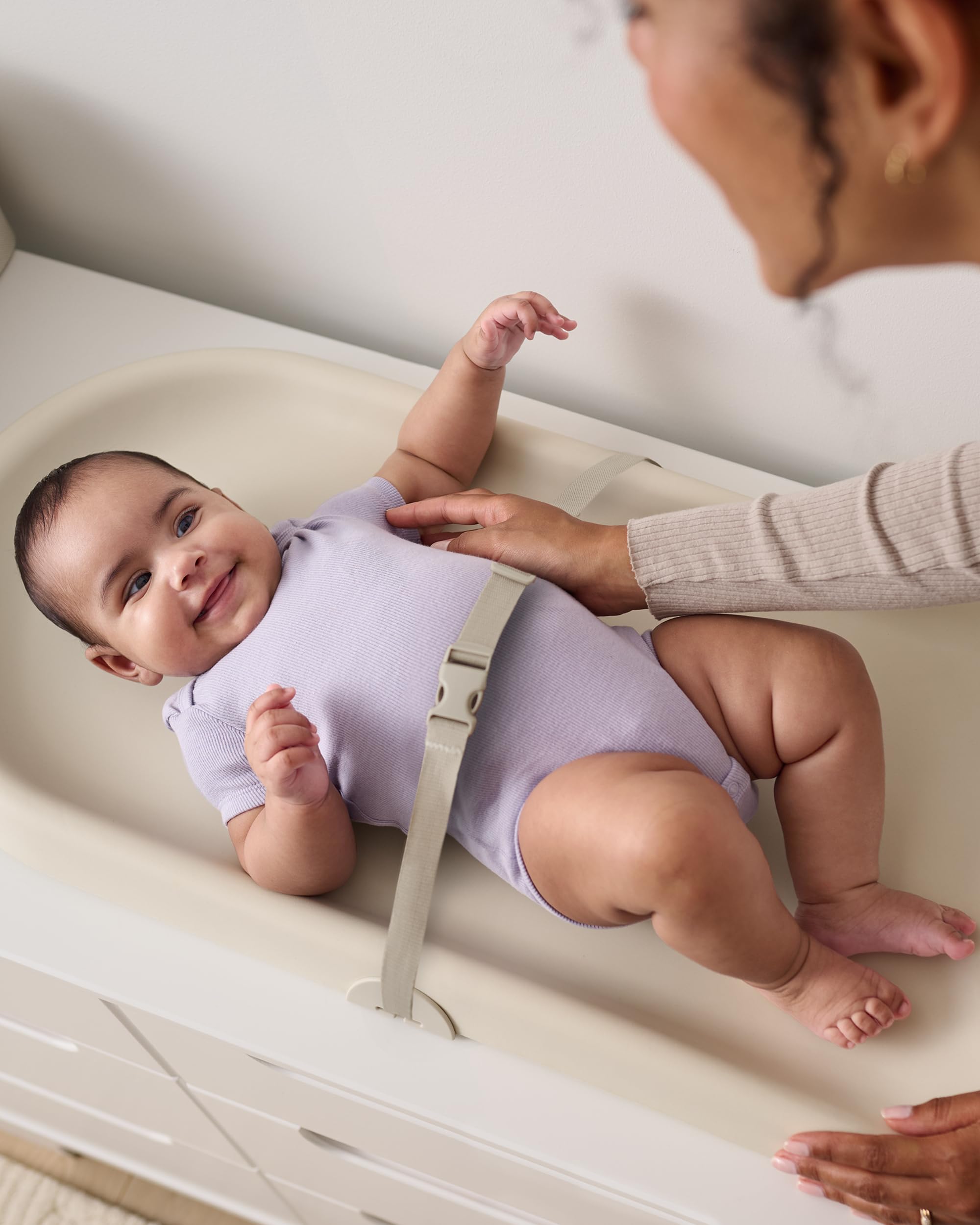 Built-In Safety Features: Equipped with a safety belt, the changing pad helps secure your baby in place during diaper changes. Our diaper pad fits standard changing tables and supports babies up to 30 lbs (13.6 kg) ensuring long-lasting use