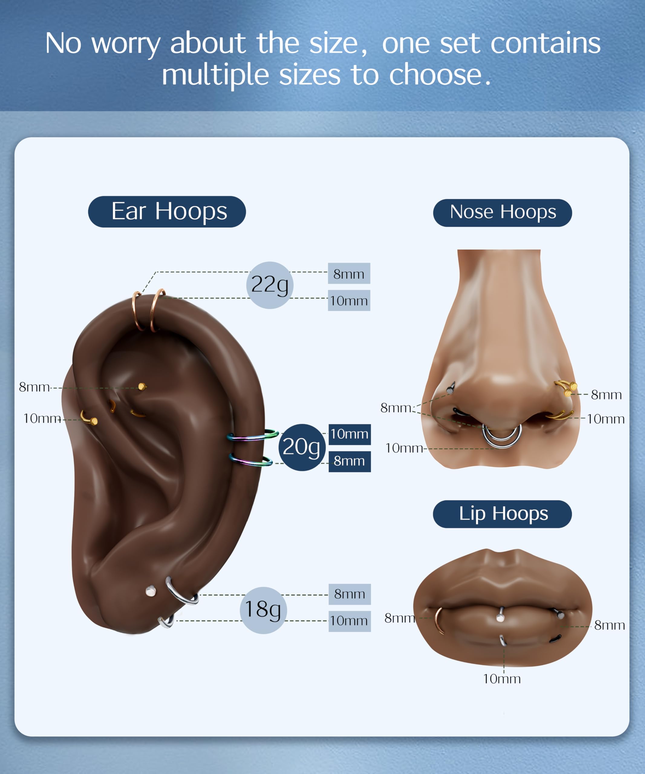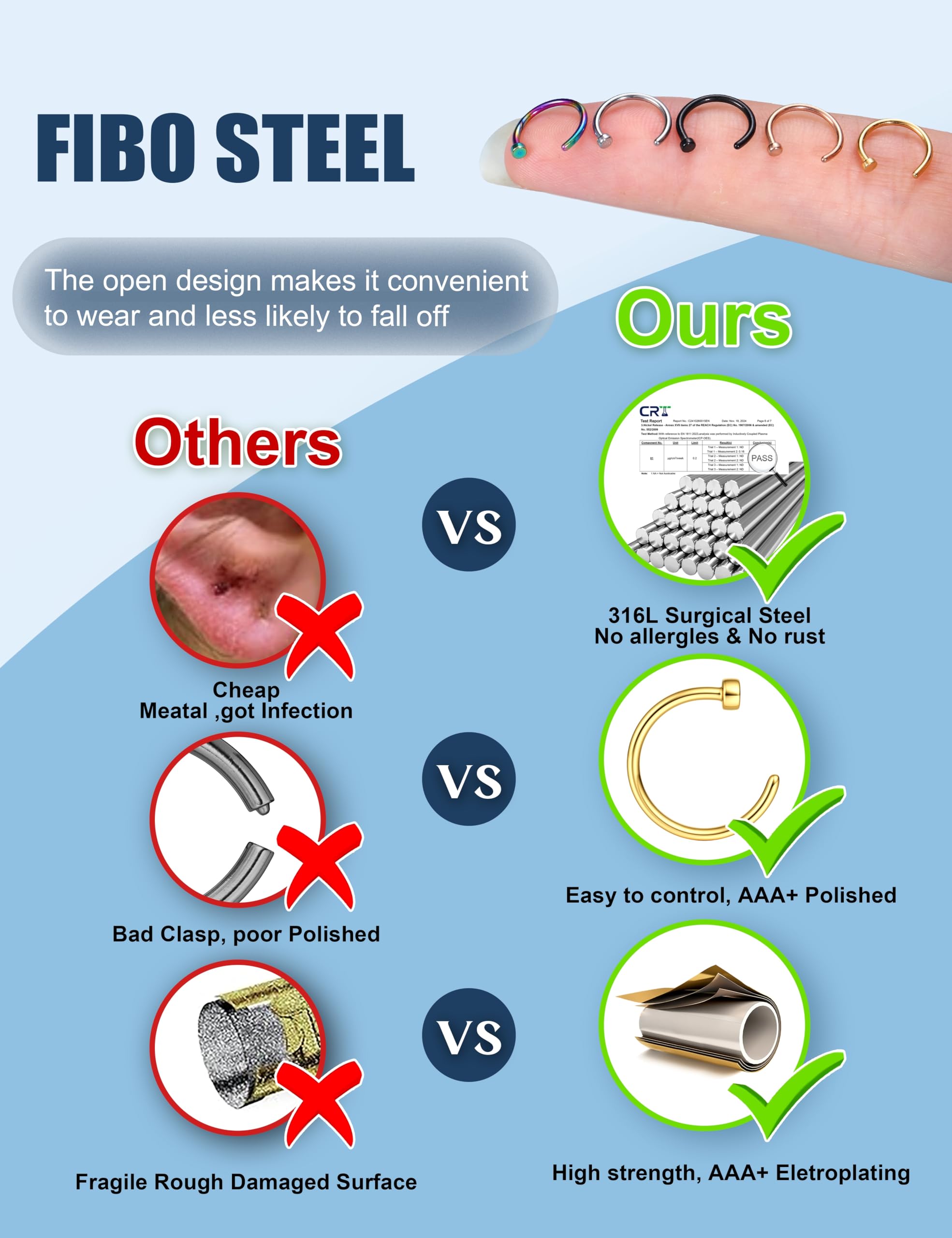 GAUGE&SIZE--The Nose Rings Thickness Is 0.6~1mm For Choice. Inner Diameter: 8mm,10mm(All Dimensions are Measured Manually with Deviation Ranged at 0.1-0.5mm). Different Size for You to Choose from,Suit both Men and Women