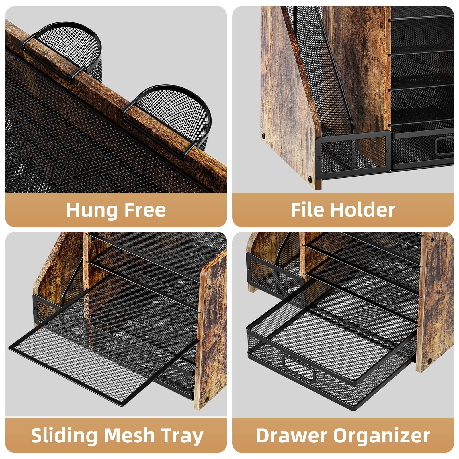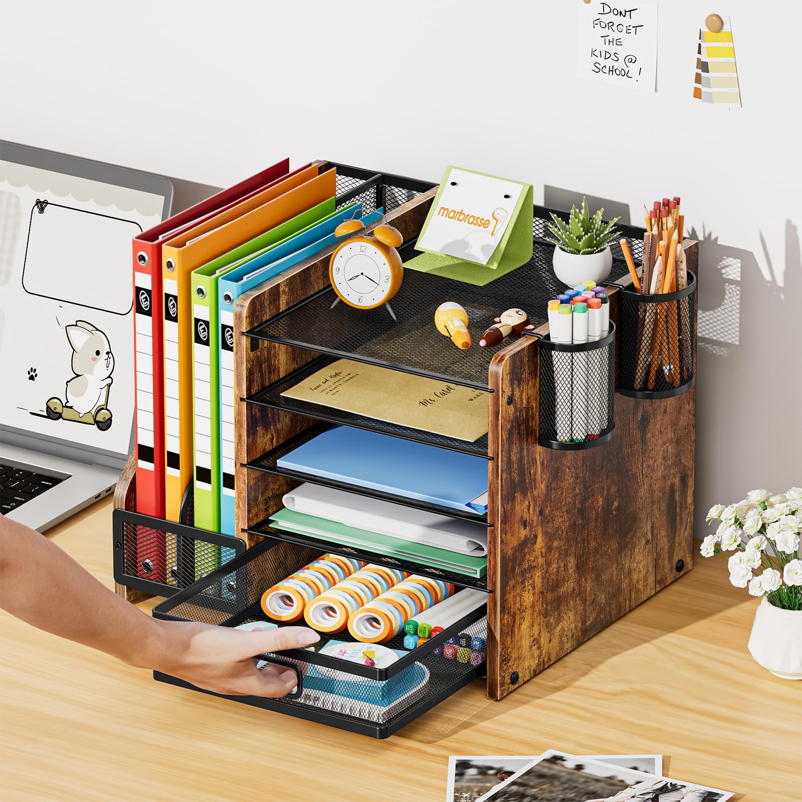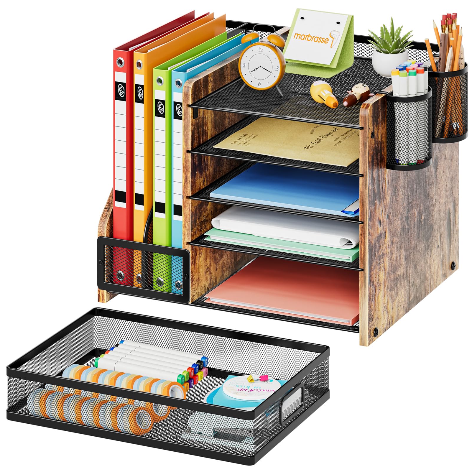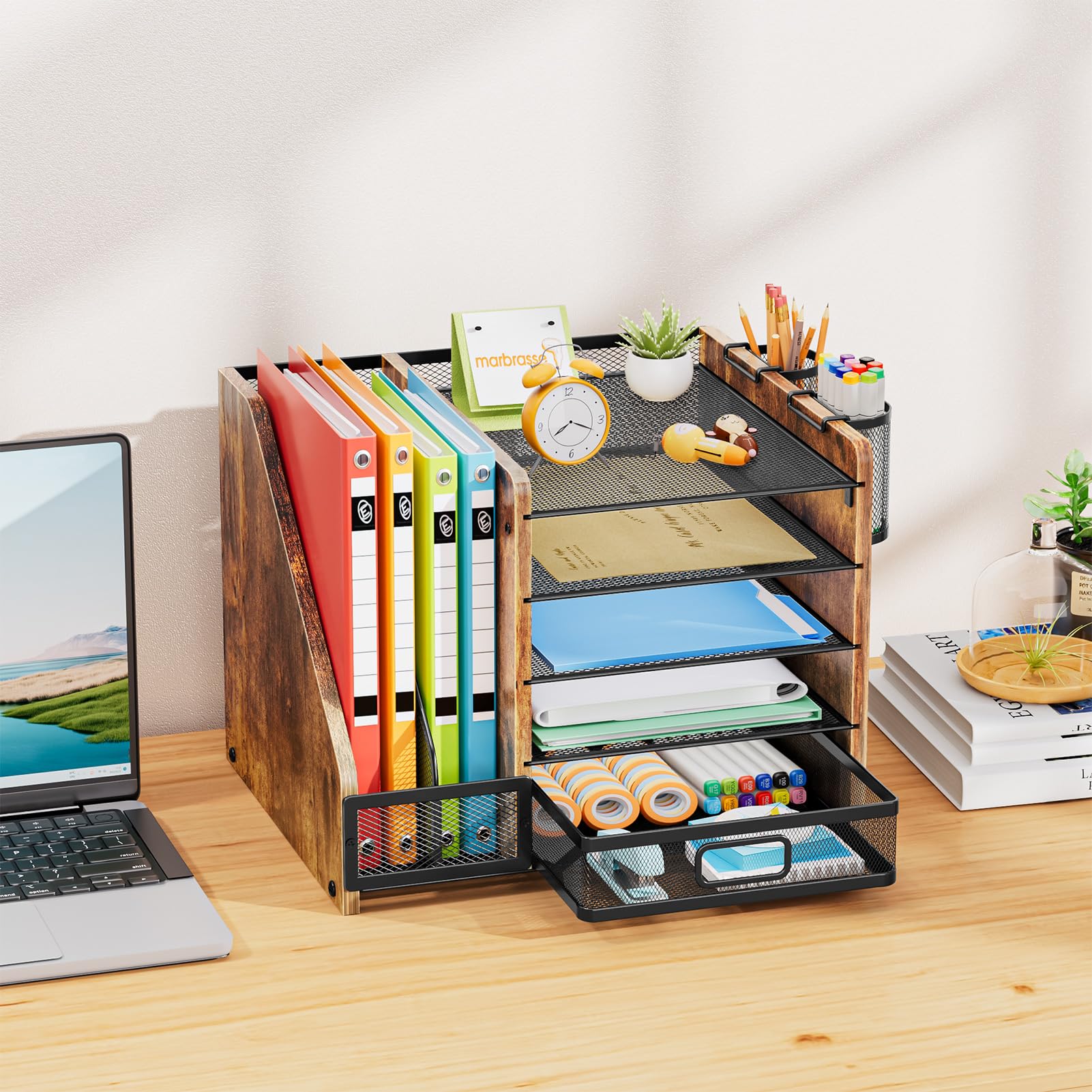 Desk Organizer:Marbrasse wooden desk file organizer. This office organization owns 5 sliding trays, 2 Magazine Holders, 2 Hanging Pencil Holders and1 sliding drawer