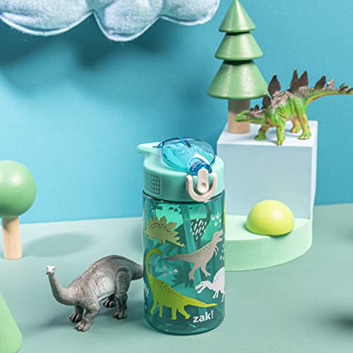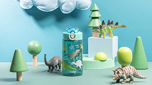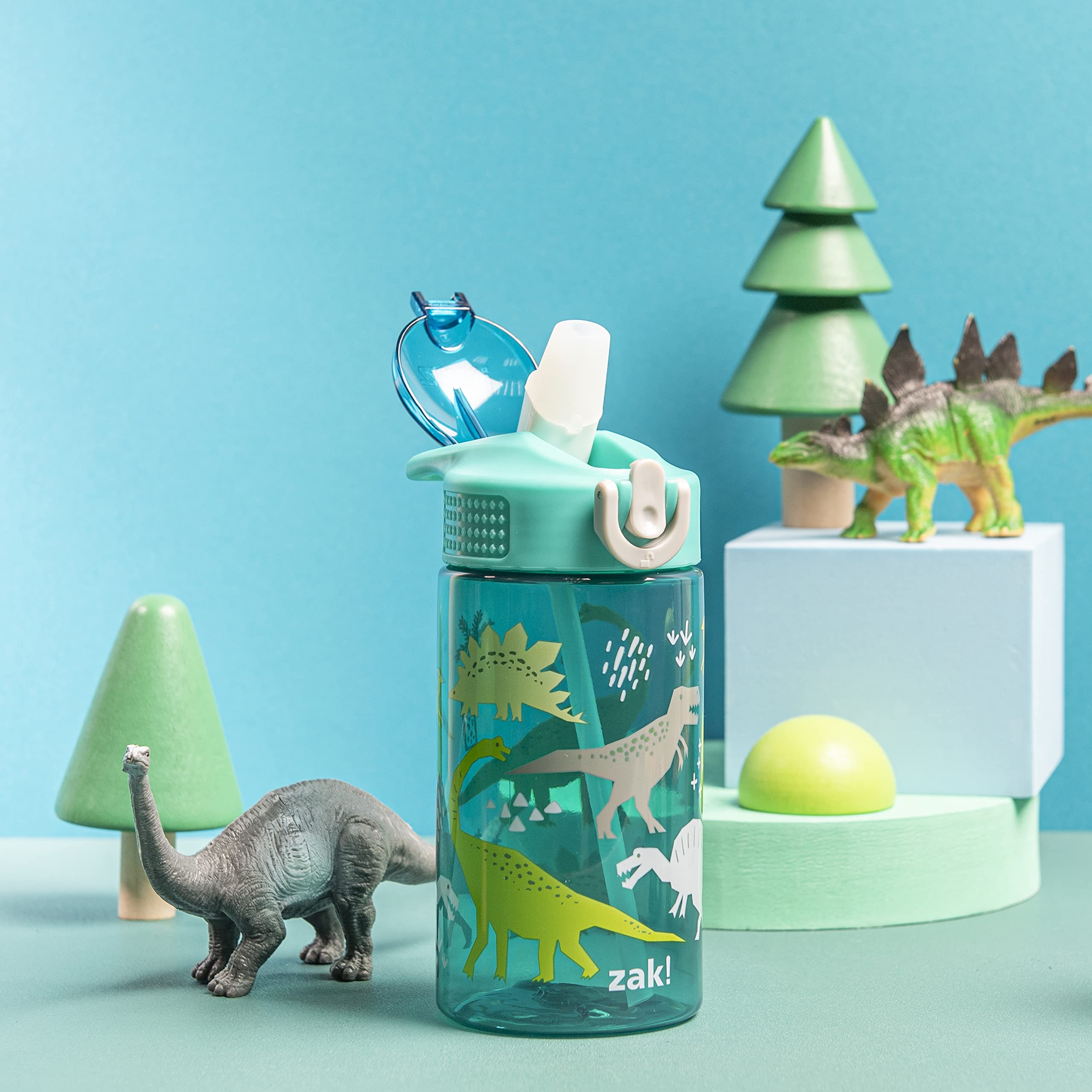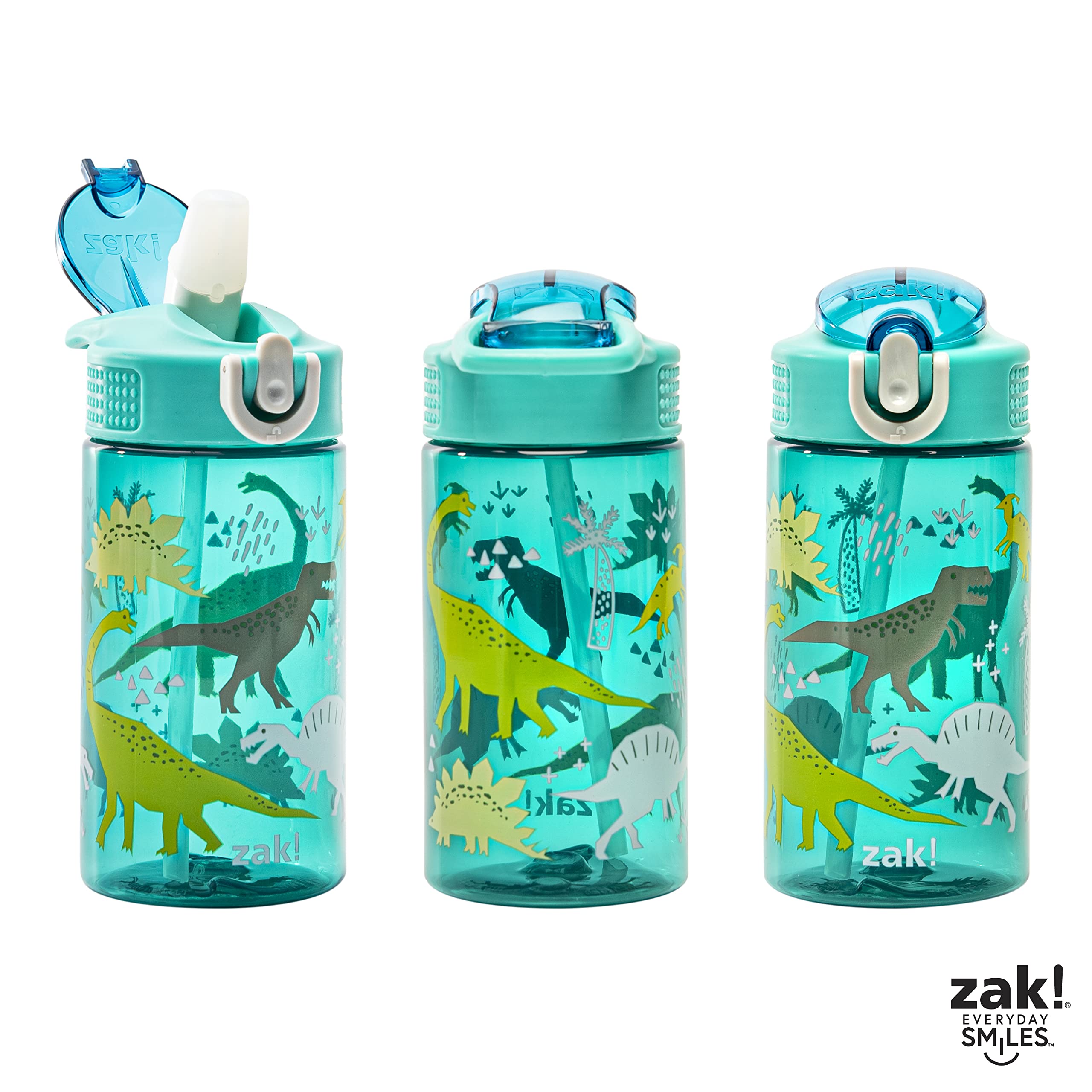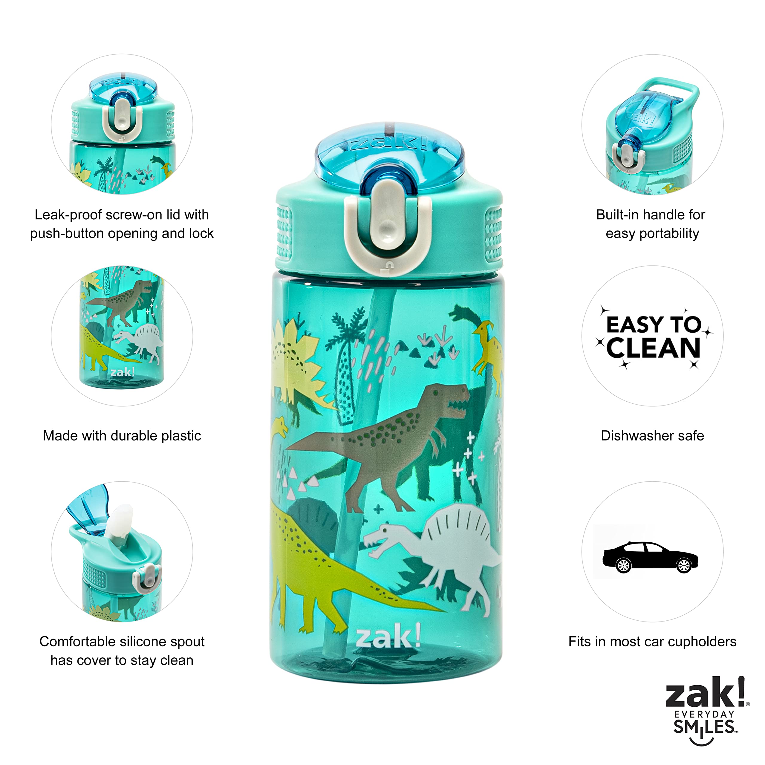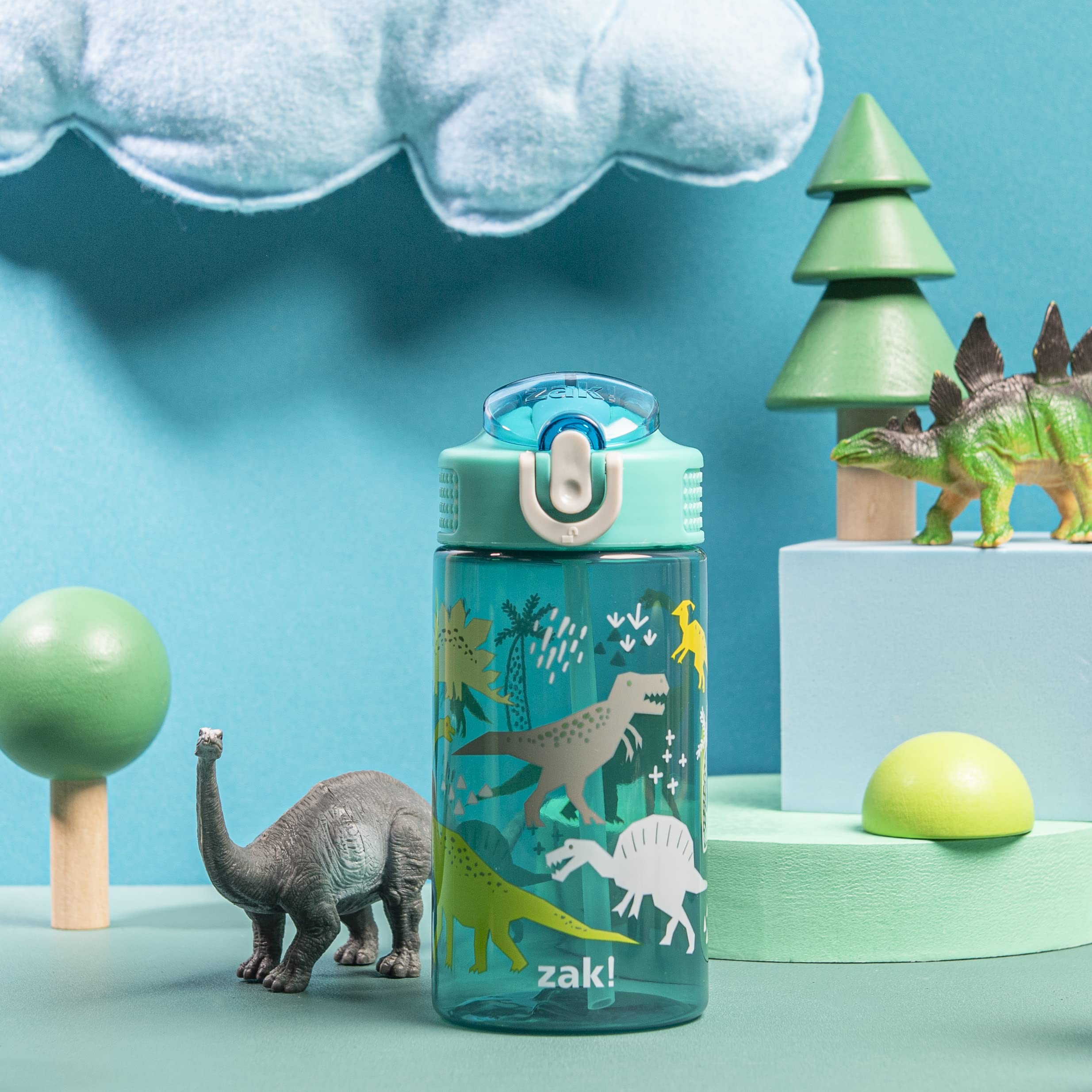 Let kids enjoy hydration with a fun water bottle by Zak Designs! Reusable and Durable Material: Reusable water bottles will last wash after wash—good news for you and the environment! The 16 oz water bottle is made of PP plastic, durable enough for kids to use every day and bring on any adventure. Leak-Proof Lid: The lid screws on securely and won't leak when the spout is closed, though water flows for easy drinking when the spout is open. The easy-open button has a flip-up lock to keep it from activating accidentally. On the Go: The water bottle has a built-in carrying loop on the lid for easy transportation, and with the spout cover to keep the spout clean and closed, it can be tossed into a bag for worry-free travel. Specifications: 16 oz capacity. Made of durable plastic. BPA-Free - Zak is committed to safety. Dishwasher safe, do not microwave. Length: 4.23-inch, Width: 2.75-inch, Height: 6.61-inch. Design: Dinosaur.