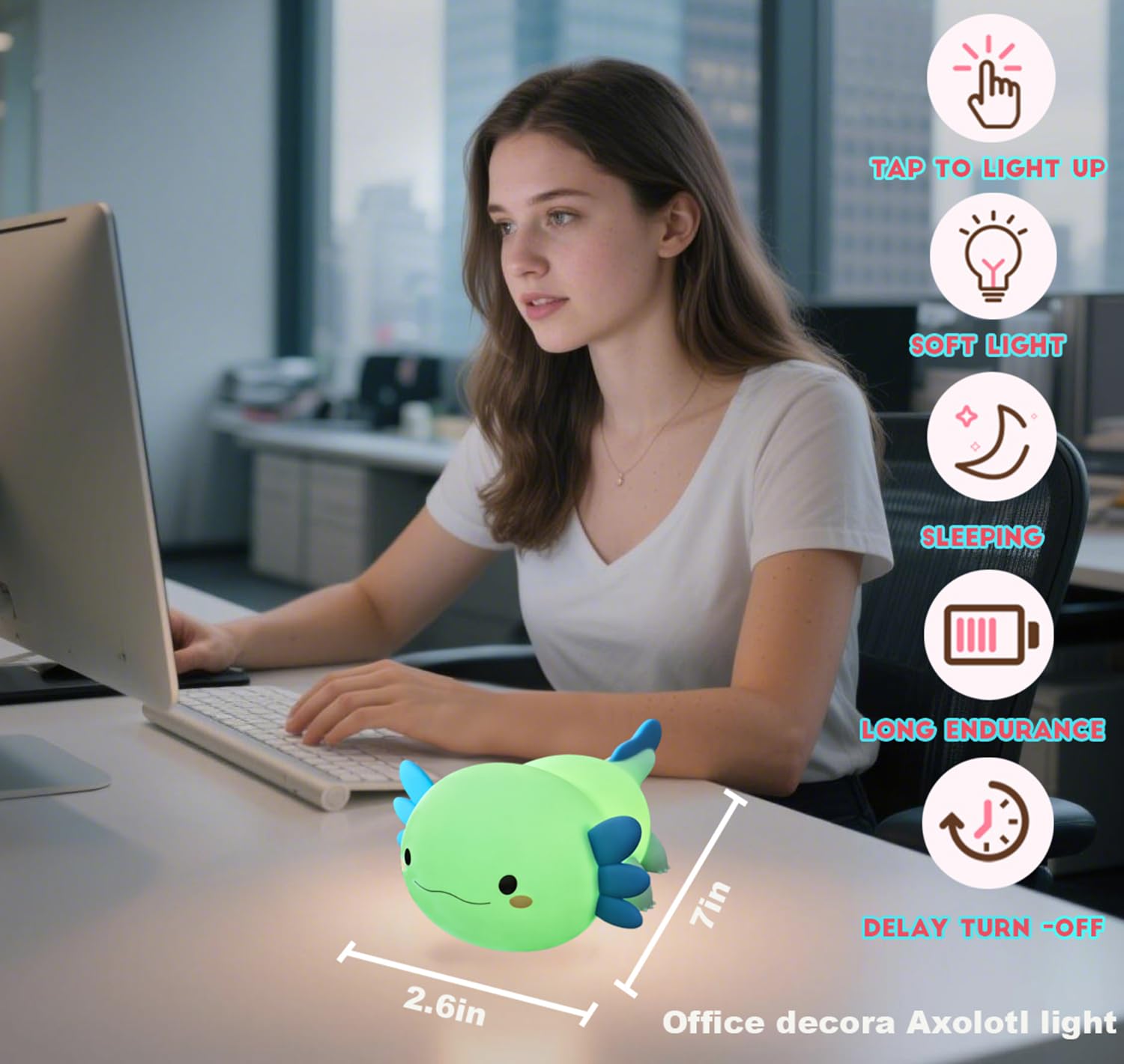 Safe and BPA Free:Cute Axolotl lamp,Using food grade safe materials,BPA free, safe for kids,soft silicone material Soft lighting,soft touch,that can be kneaded freely,axolotl night light is a cute bedtime toy for kids to relieve stress,It is also a cute kids room decor