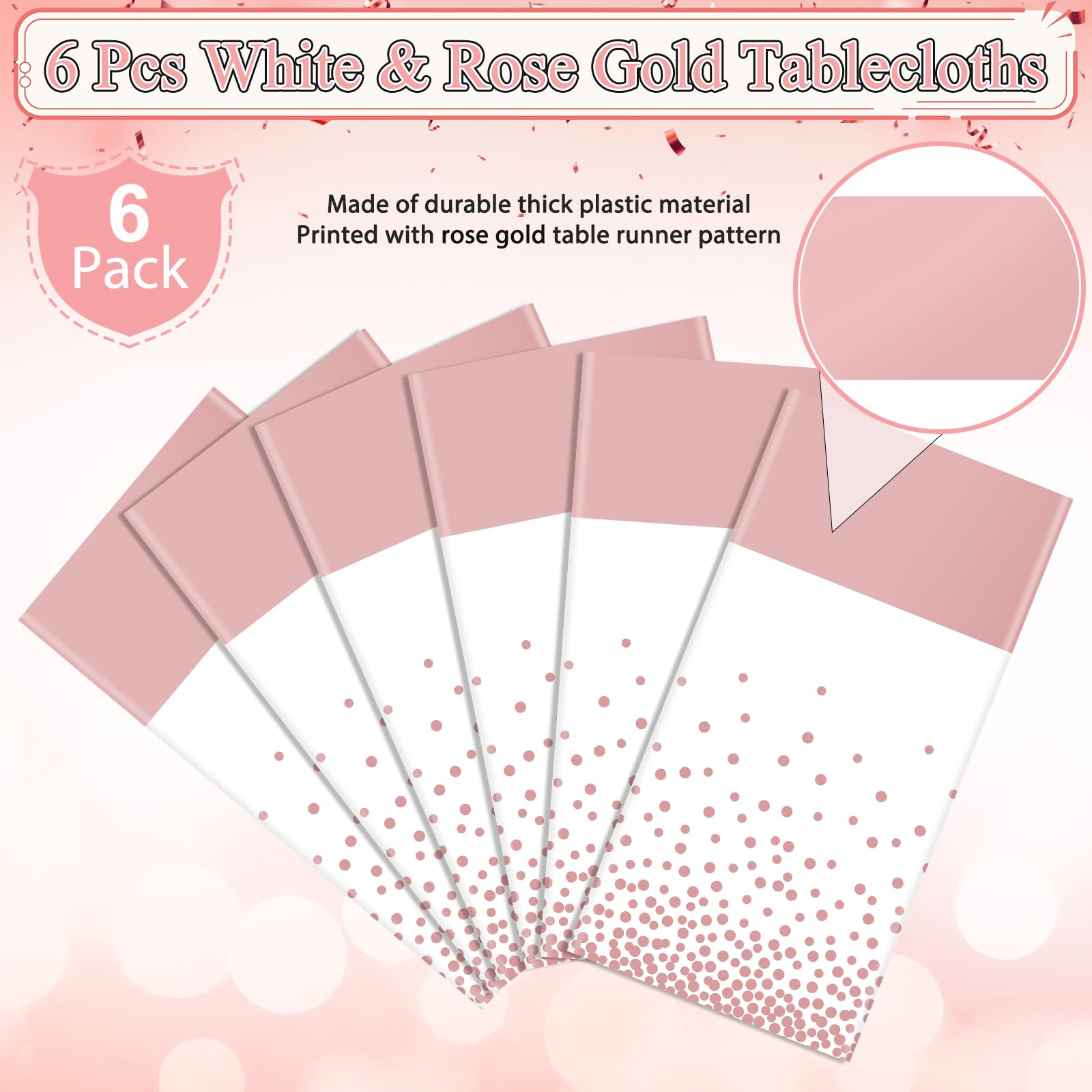 What will you receive: 6 pieces plastic white and rose gold party tablecloth,all over printed with rose gold dot on white background,the rose gold table runner in the middle is printed pattern,ideal for decorating your graduation birthday party supplies and decorations