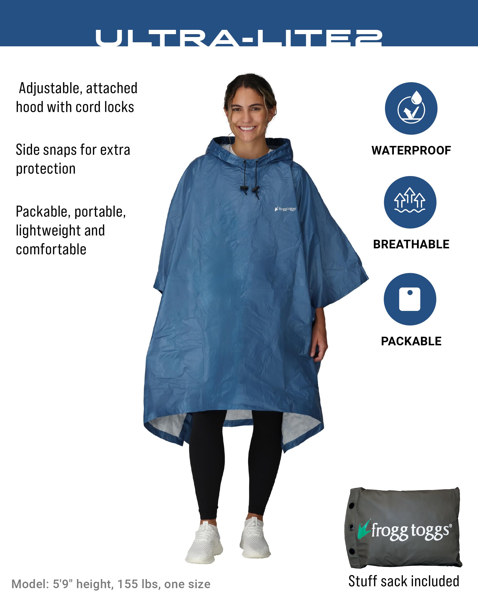 Description Expect the unexpected with the Frogg Toggs Ultra-Lite² Poncho. Designed to be lightweight with a stuck sack to keep the poncho on hand without being inconvenient.