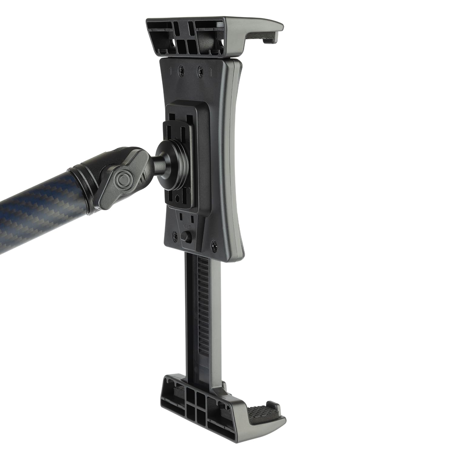 [INTEGRATED 20MM MOUNTING BALL] on the back side of the tablet holder is an integrated 20mm (0.787 inches) mounting ball which attaches seamlessly to the included 7cm Matte Carbon Fiber + Kevlar Mounting Arm.