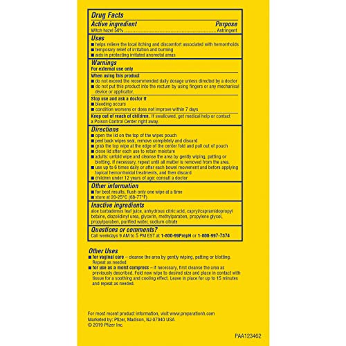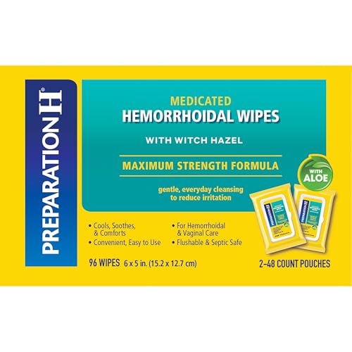 Preparation H Hemorrhoid Wipes with Witch Hazel offer soothing, cleansing relief of irritation caused by hemorrhoids. Even mild irritation around the butt can be an uncomfortable and persistent problem. When other hemorrhoid treatments aren't providing the comfort you need, these flushable, septic-safe wipes combine the relief you trust from Preparation H hemorrhoid care products with soothing aloe and cleansing witch hazel for gentle daily hemorrhoid care. These itch relief wipes also help relieve itching associated with hemorrhoids. Apply these Preparation H wipes 3-4 times daily for fast acting hemorrhoid care. Get comfortable with it, with hemorrhoid relief from Preparation H, the number 1 doctor recommended brand for hemorrhoid treatment (1). (1) Among OTC brands