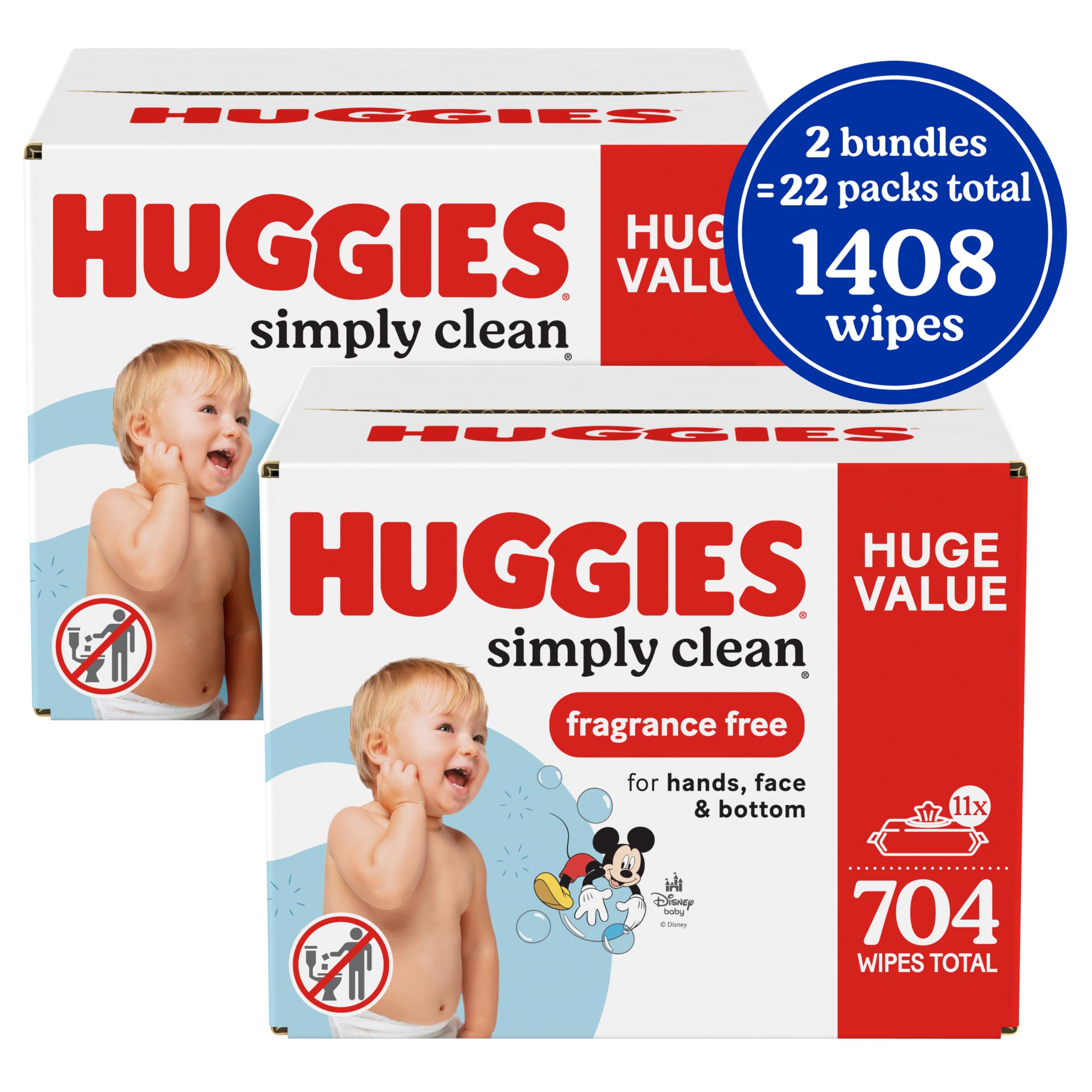 11 flip-top packs of 64 unscented baby wipes (704 wipes total); packaging and lid style may vary