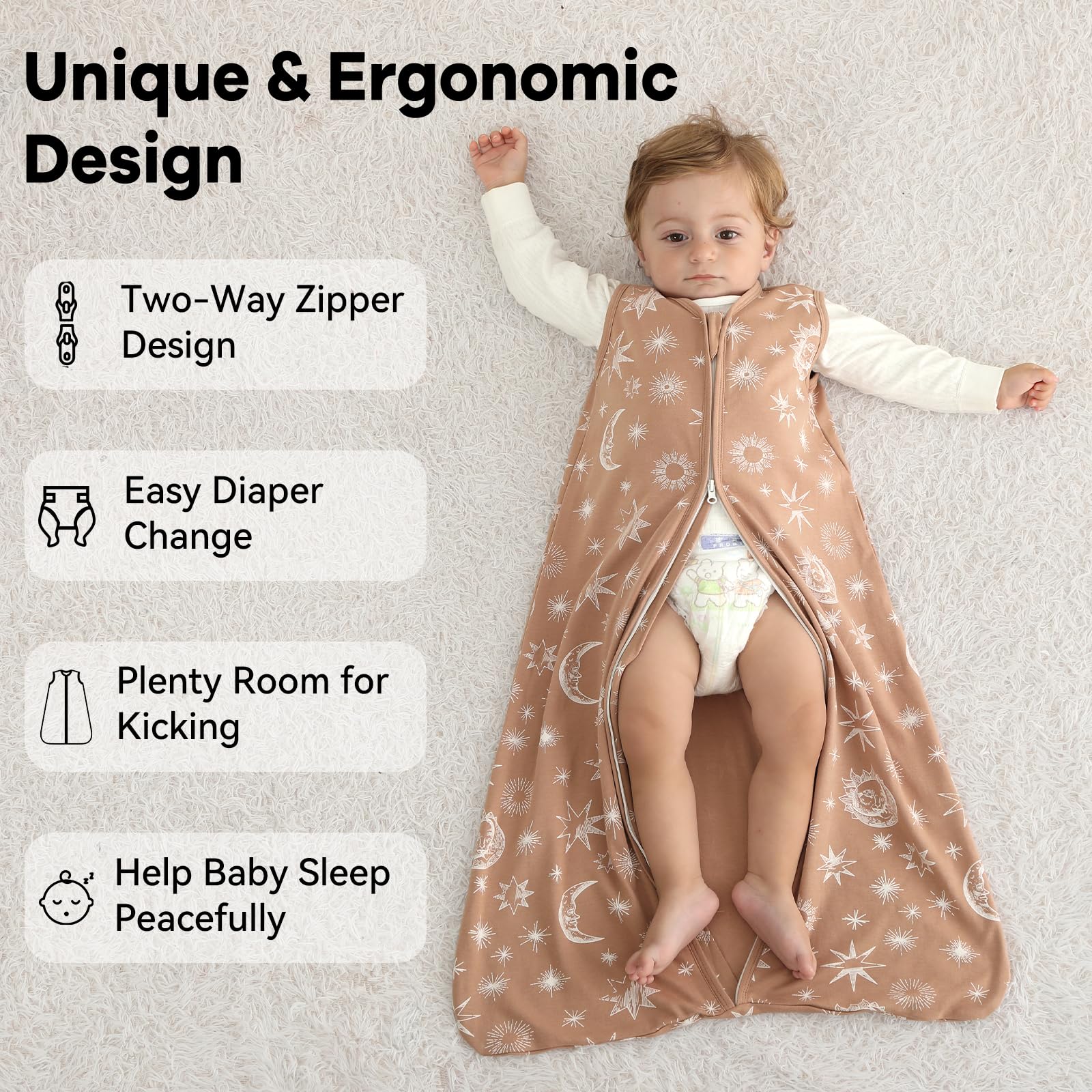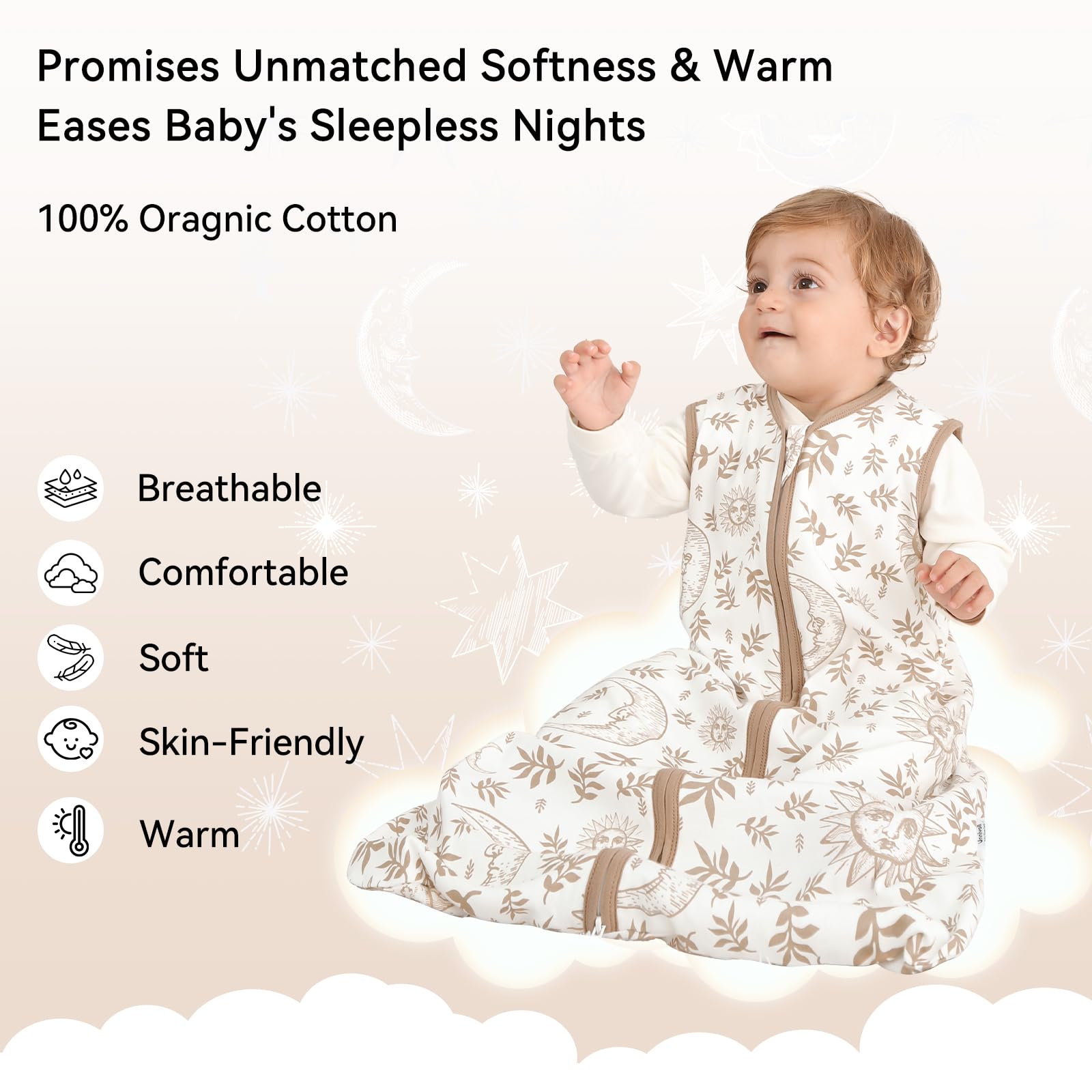 ACCOMPANY BABY'S GROWTH-Four size options available for your choice, S(0-6 months/10-18 pounds), M(6-12 months/16-24 pounds), L(12-18 months/22-28 pounds), XL(18-24 months/26-34 pounds). Unnivoll sleep sack is essential for everyday use, keep your baby cozy and sleeping peacefully!