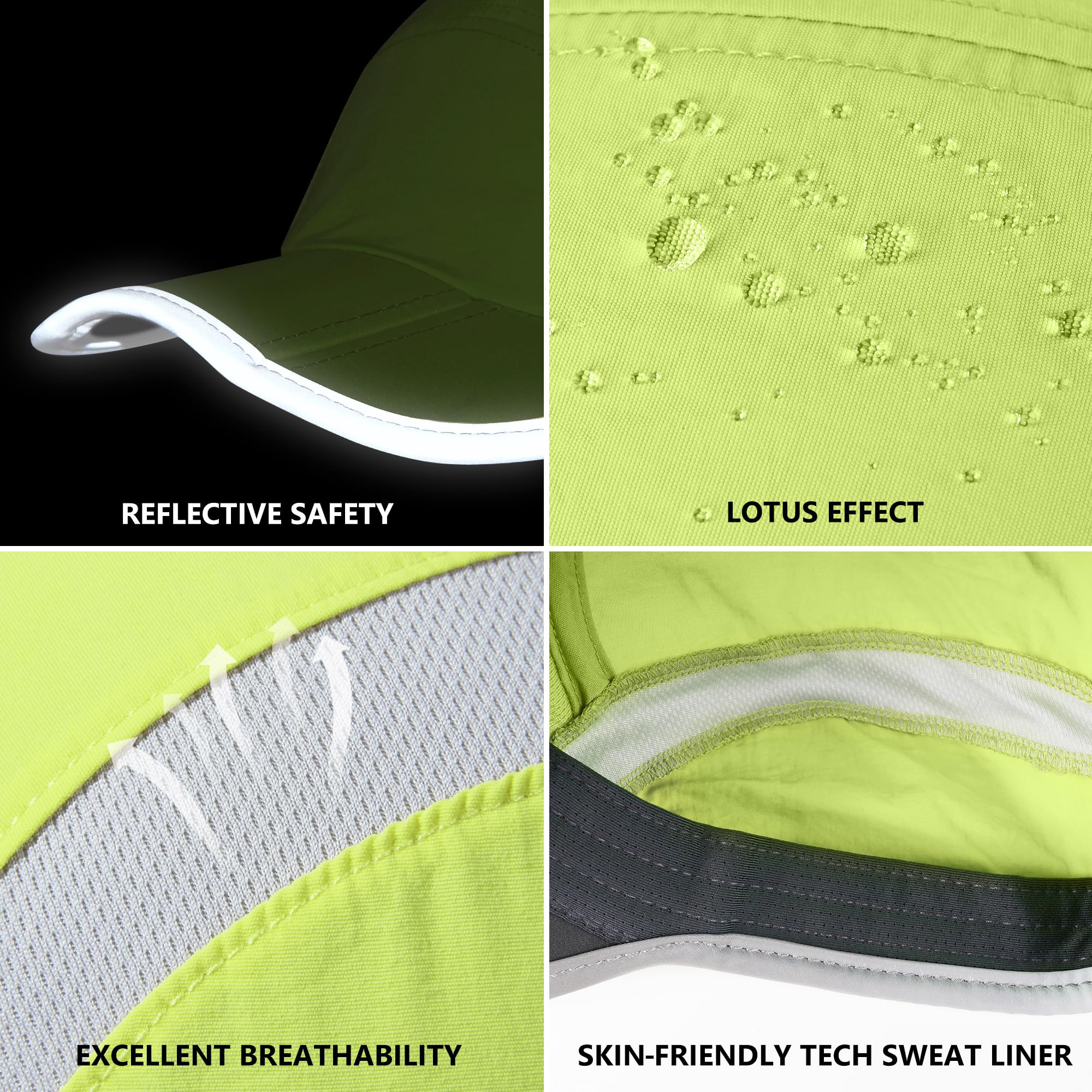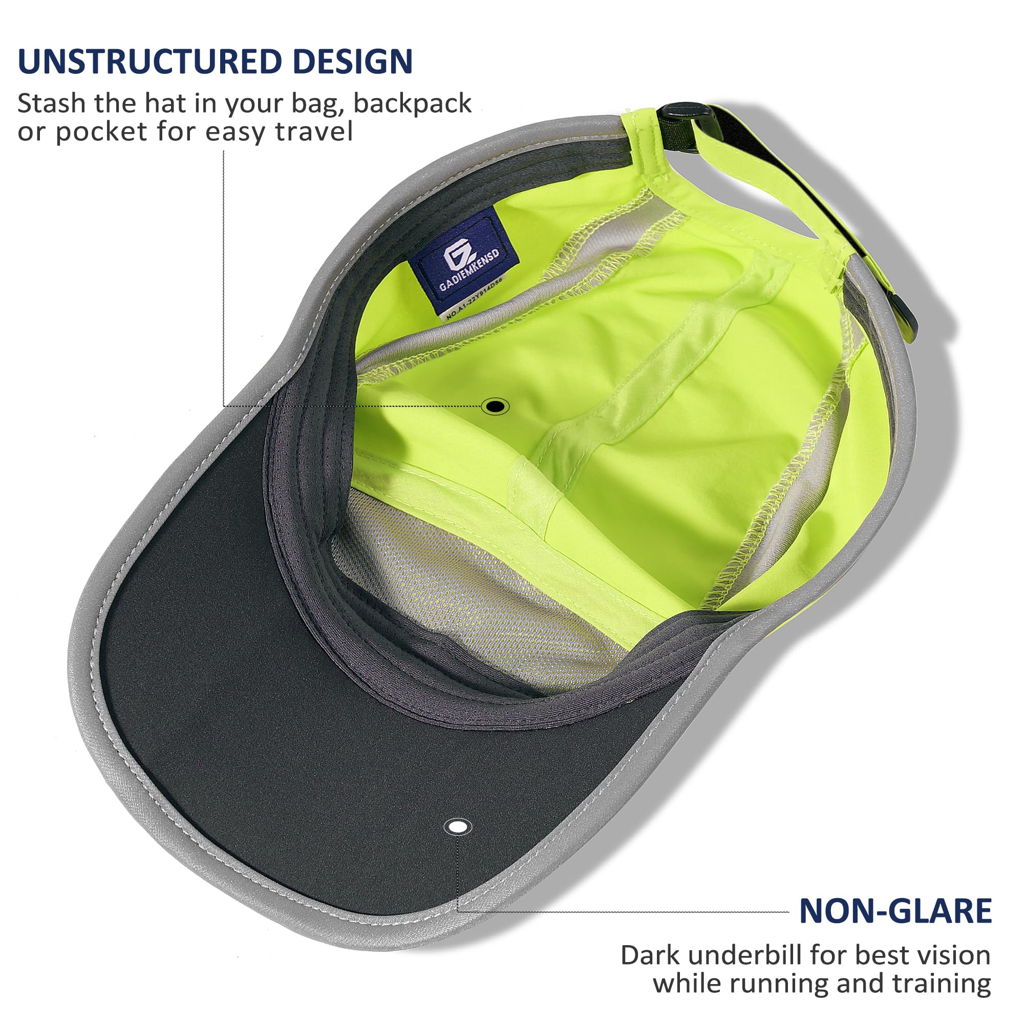 Reflective Foldable Brim: The brim with 3-panel bill design, can be folded and fit into any pocket or backpack. Reflective Brim for increased visibility and safety on low-light runs