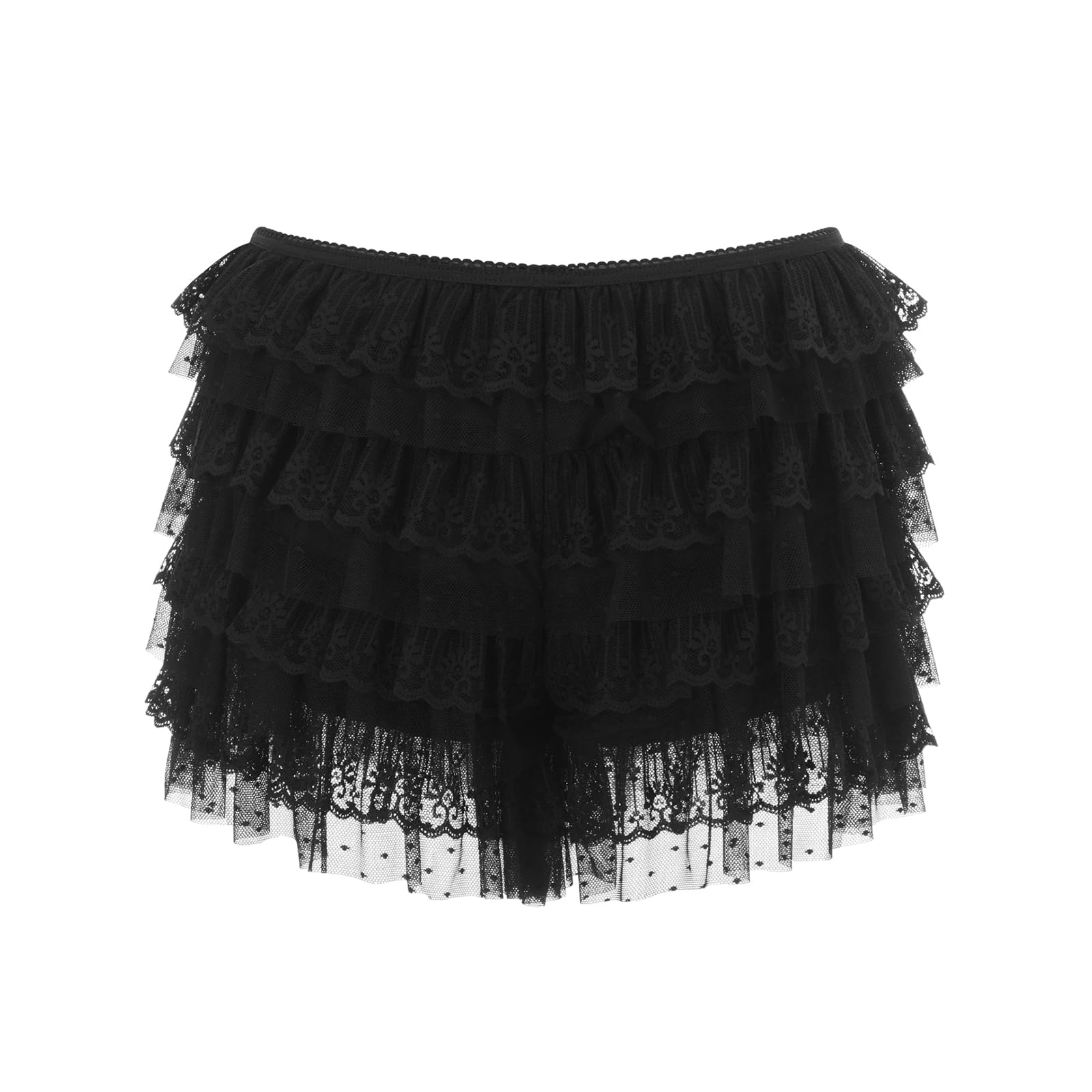 Design: Bodycon shorts, low rise shorts pant, slim fit, high elastic waist, going out pettipants, with ruffle frill hemline. Scallop hem, crochet lace mini hot pants, black bloomers, ruffles frill layered, layered ruffles and bow trim, versatile vintage look.