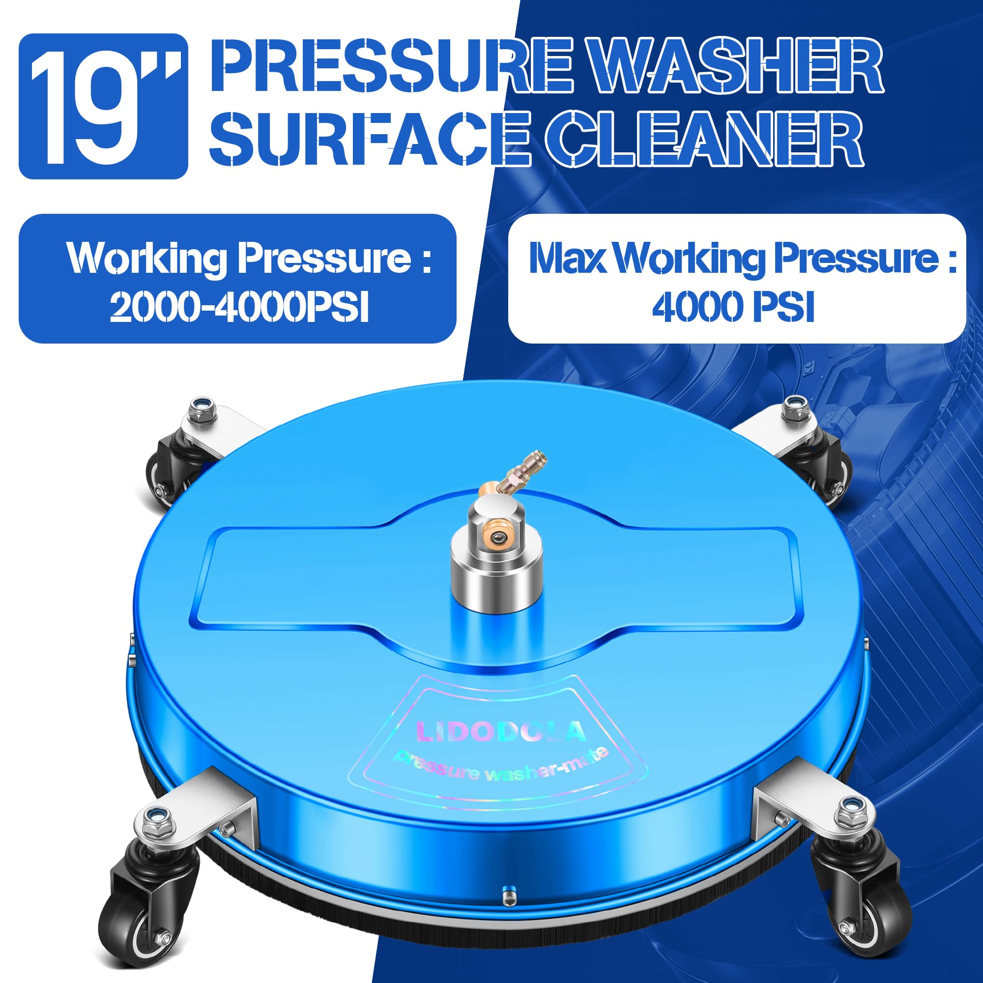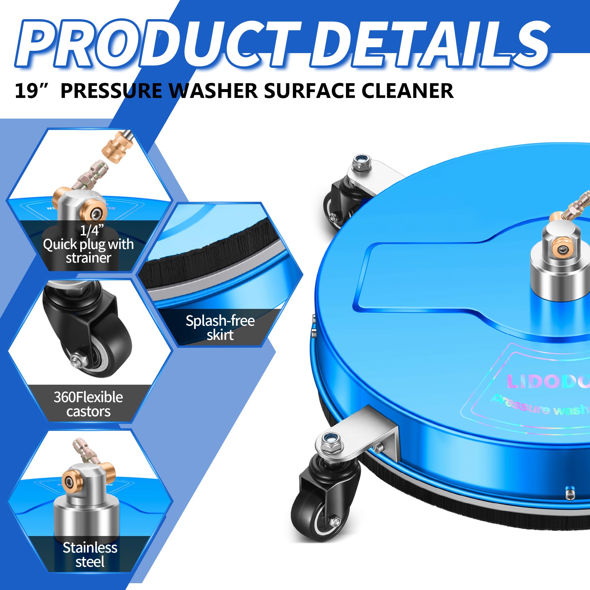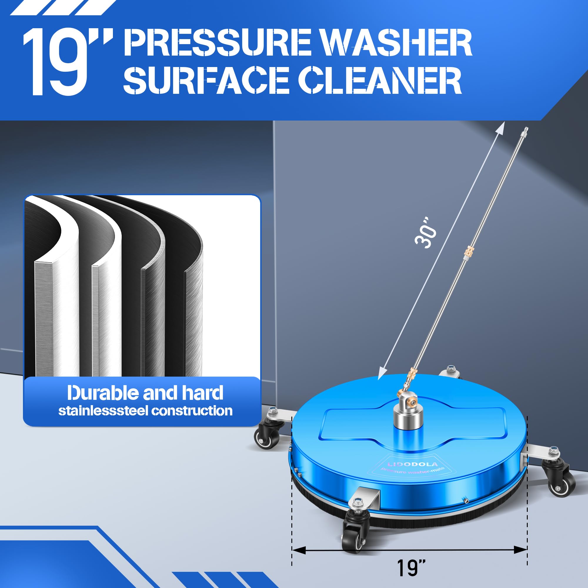 PROFESSIONAL CLEANING – The Lidodola surface cleaner achieves high-performance cleaning across a 19" wide area with dual spinning nozzles, delivering thorough removal of stubborn stains on driveways, decks, sidewalks, and other large surfaces.