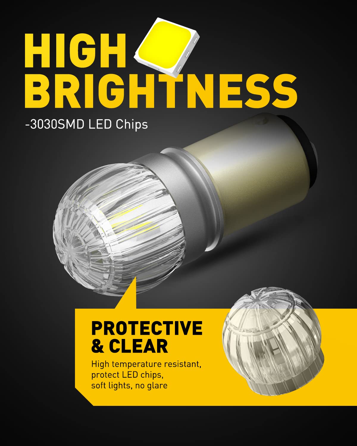 【Ultra Bright & Safer Upgrade】 AUXITO 1157 led bulbs white utilize newest powerful and high quality 3030SMD led chips. Generating 400% brighter output and larger lighting area than halogen, see more clearly when reversing. Keep safe