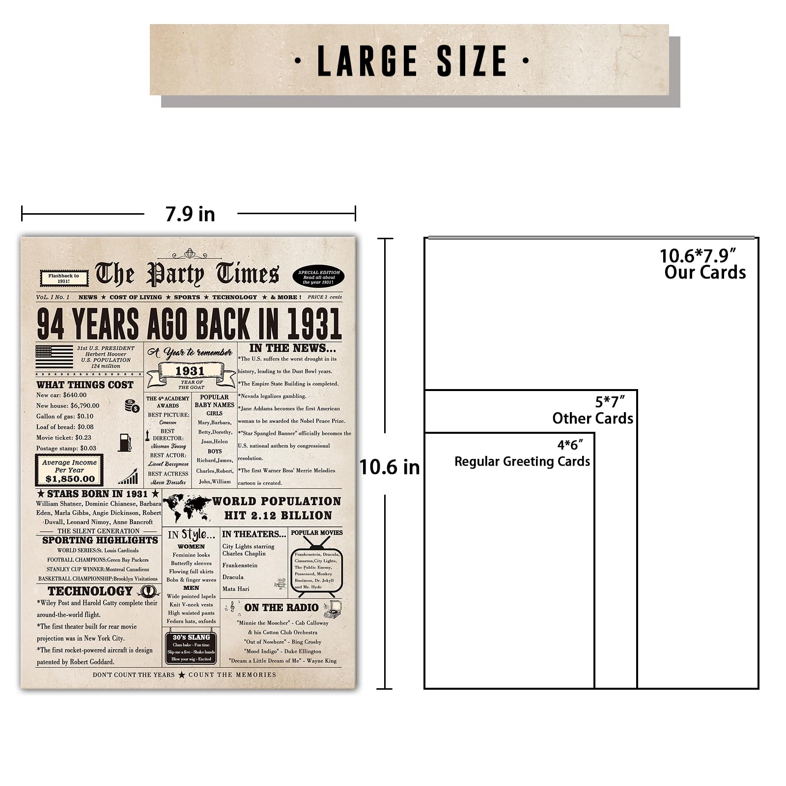 This large 94th birthday card features a vintage newspaper design, showcasing important events, movies and sports events from 94 years ago.