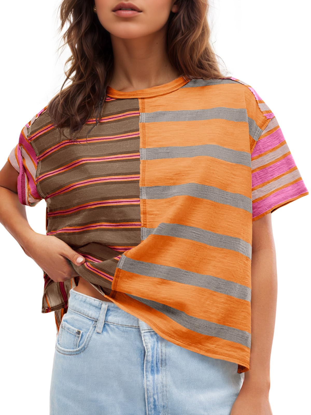 Features: The fashion tops feature with striped, color block, short sleeve, crew neck, round neck, drop shoulder, side slit hem, loose fit