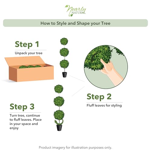 Elegantly greet guests with this triple boxwood topiary. Three perfectly trimmed boxwood balls sit in synergy and are made of realistic-looking boxwood foliage. You can now enjoy the sophistication of the boxwood without maintenance or care. Standing 3' from a black nursery planter (included in height), curate in compact spaces. Perfect for an apartment, bathroom, room corner, or foyer.Silk trees are manufactured using synthetic materials, such as polyester material or plastic, and are well designed and constructed to be life-like in appearance. This item will need to be re-shaped when removed from the secure box to allow it to reach its fullest size. Your artificial plant will look beautiful for years to come; simply wipe clean with a soft dry cloth when needed. About Nearly Natural Inc. - For over 75 years, Nearly Natural Inc. has been providing conscientious consumers with beautiful alternatives to natural decorations. Employing and advised by naturalists who understand the live plant world, Nearly Natural is able to recreate the most realistic-looking decorative items for homes, offices, and businesses. Driven by a true commitment to customer service, attention to detail, and natural philosophy, Nearly Natural strives to bring customers the most beautiful, unique, and striking faux plants and floral on the market. Construction materials: Iron Wire, Plastic