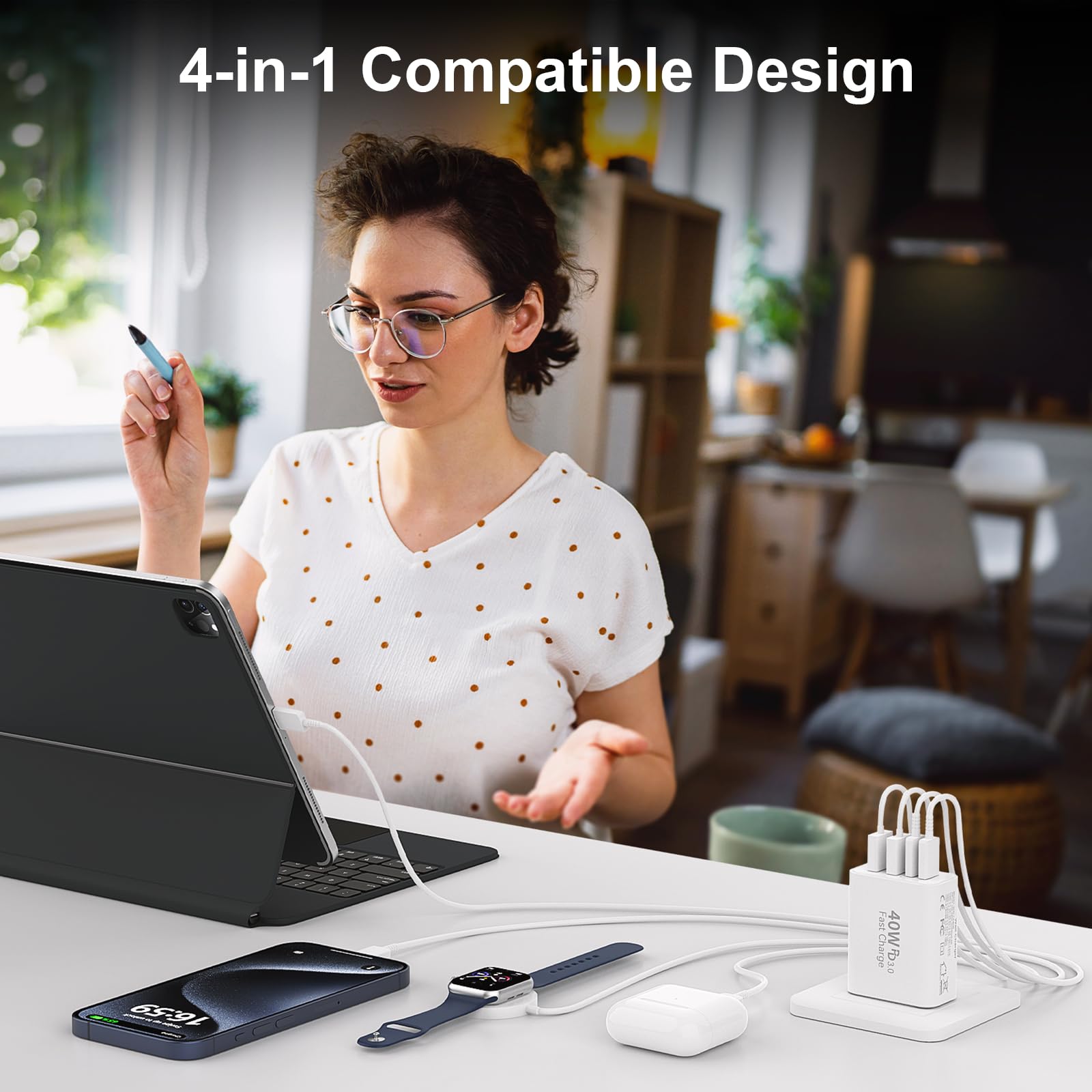 4-IN-1 High Speed Charging Cube for Multi Devices: with 2 USB-C ports and 2 USB-A ports, the newest wall charger brick can fast charge 4 devices simultaneously for efficient power distribution, such as phones, tablets, cameras, power banks, headphones, smartwatches, Swtich etc. One for all, save your outlet space instead of occupying 4 wall sockets. It is the best replacement for your original USB chargers
