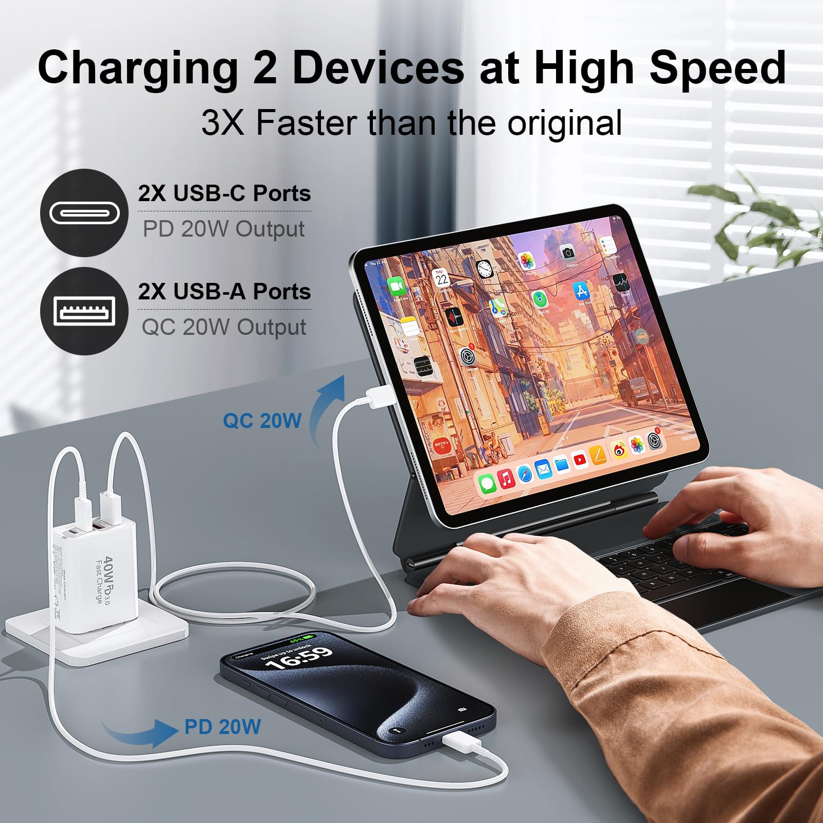 2-Pack 40W USB C Charger Fast Charging Blocks: Auorld 40W USB C Fast Charging Blocks support the Power Delivery and Quick Charge 3.0 fast charging functions with a total power of up to 40W. The USB-A port offers an output power of 3.1 A/5 V, while each USB-C port provides Max 20W output power, charge your Phone 16 15 Pro Max up to 50% in just 30mins