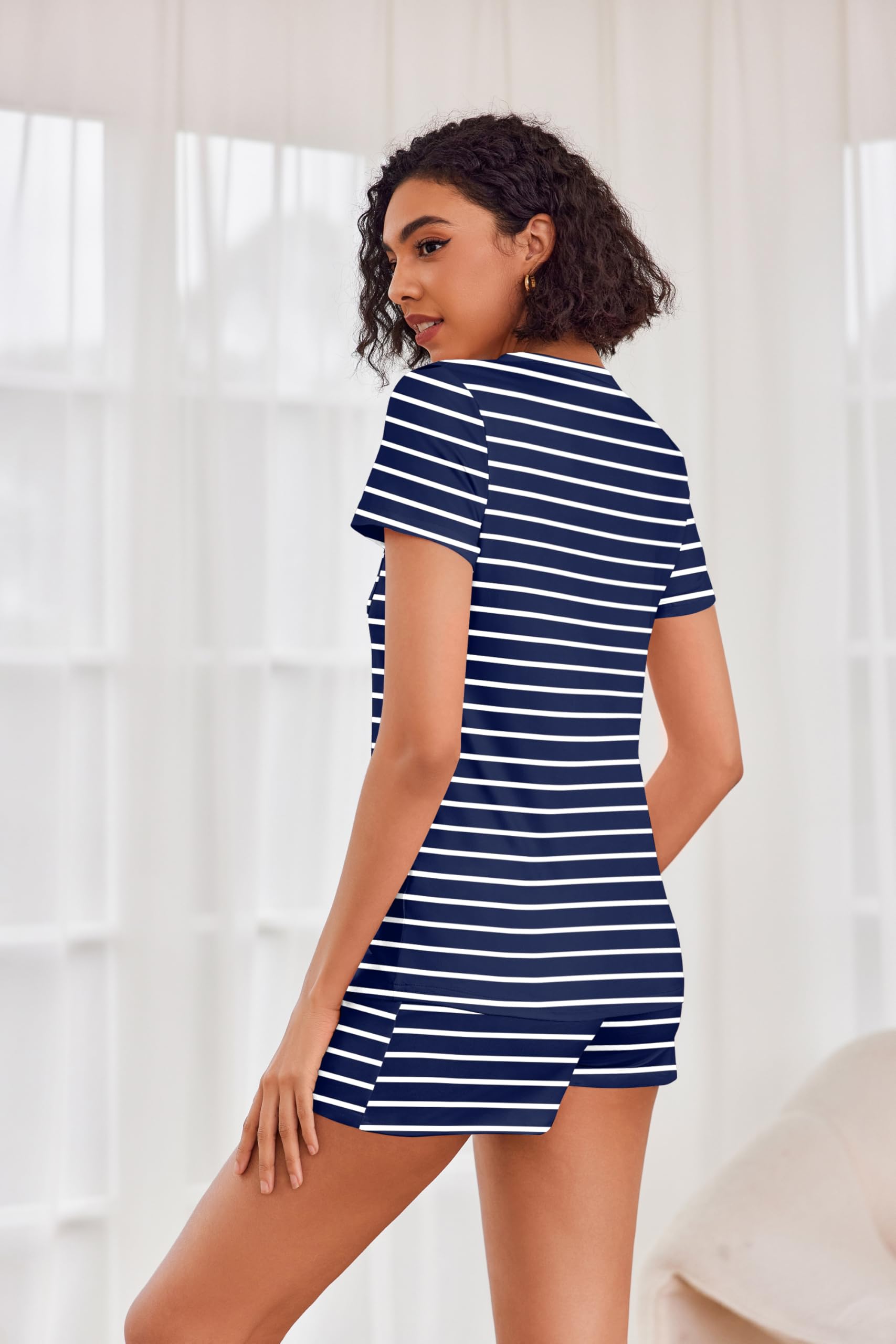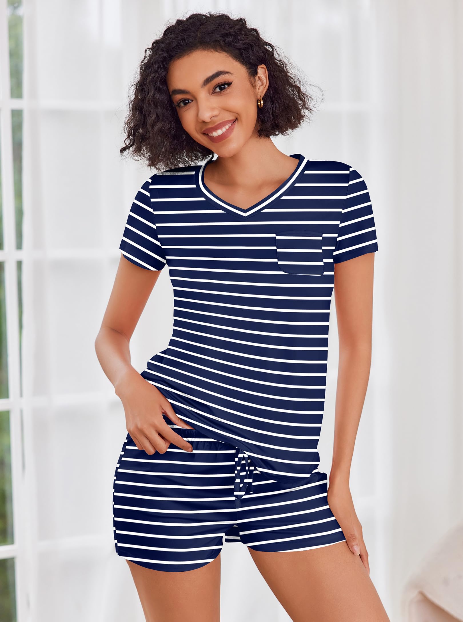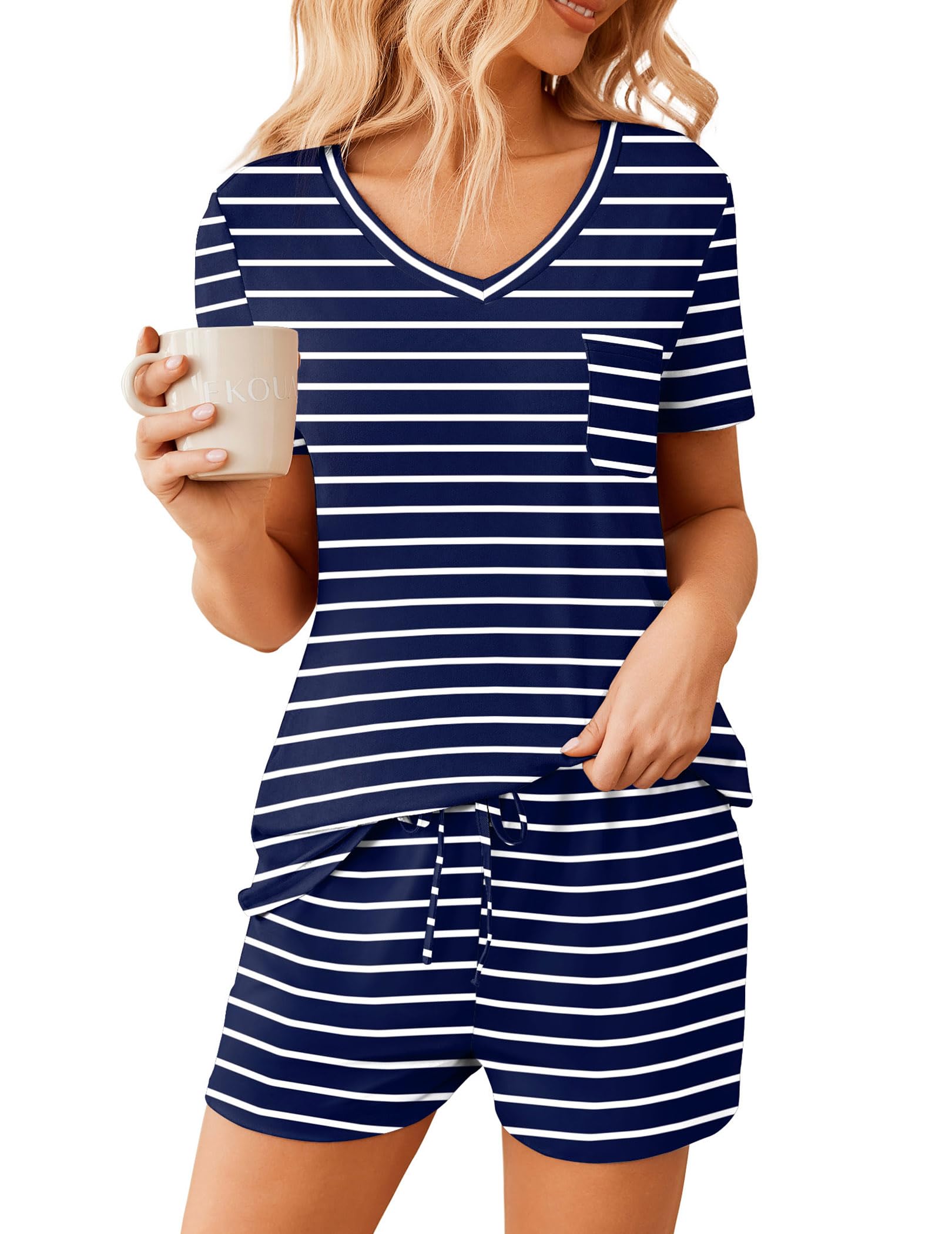 FEATURES: pajama sets for women 2 piece, pj sets for woman, V neck women's pajama sets, short sleeve T-shirt, drawstring elastic waist shorts.