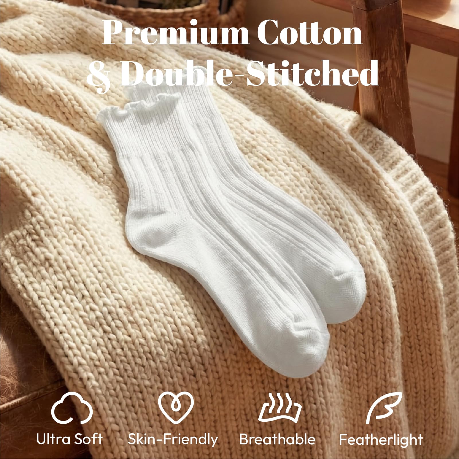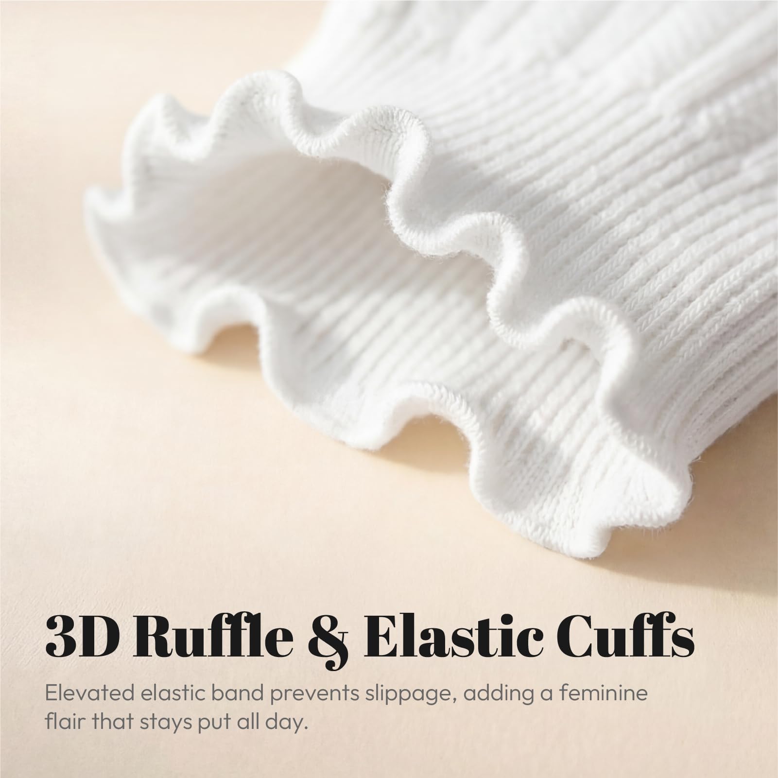 [Comfortable fabrics]Crafted from ultra-soft cotton blend, these breathable ruffle socks woman keep feet fresh without irritation. The seamless toe design prevents rubbing, making them perfect for all-day wear. Enjoy cloud-like comfort whether you're out doing activities or relaxing at home.