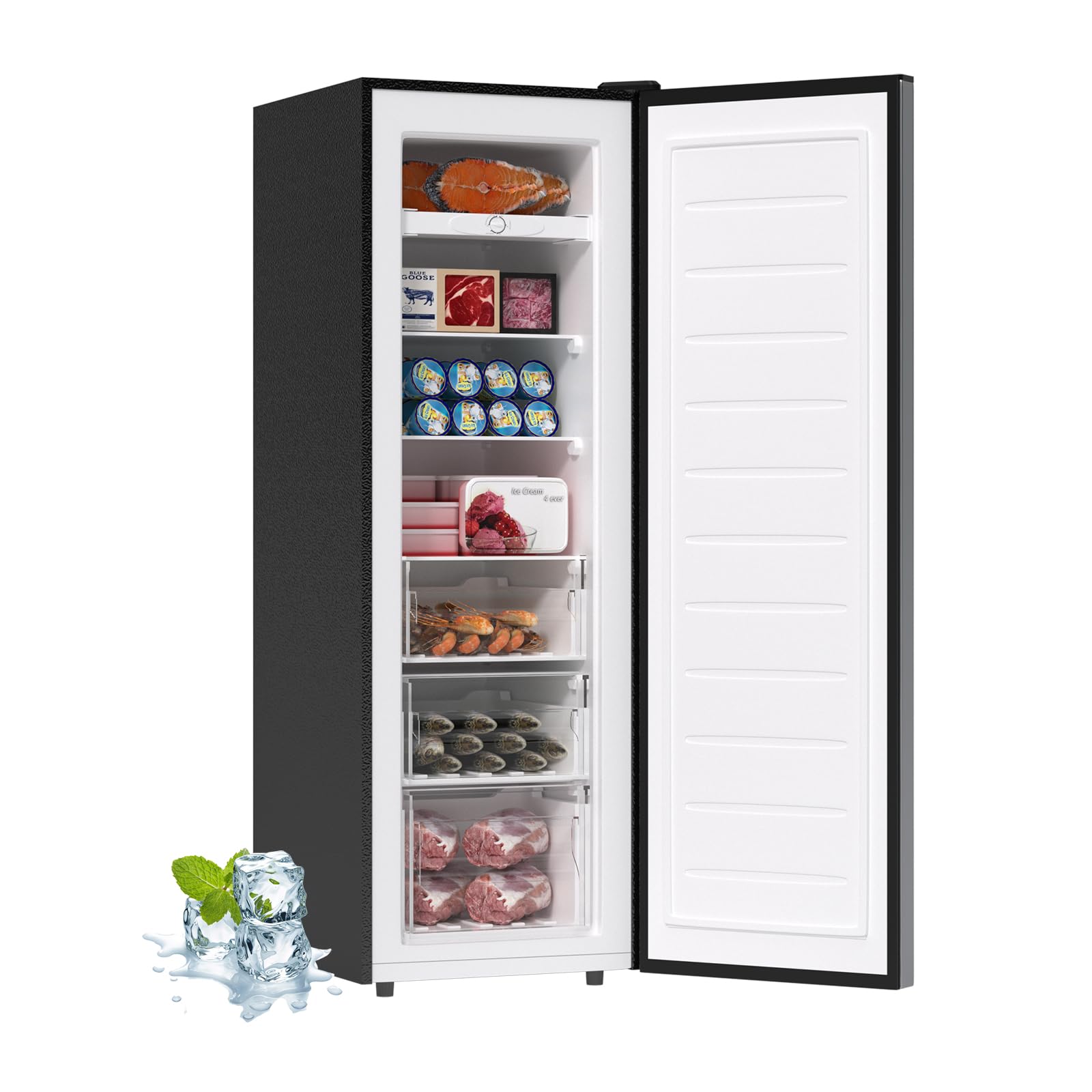 Freezer Size:The Bangson 7 cu. ft. Upright Freezer provides ample storage space for fruits/vegetables/seafood/ice cream so you can always enjoy fresh food. You can remove the crisper depending on the food placement. Dimensions: 21.5 inches L, 23.5 inches D, and 56.2 inches H.
