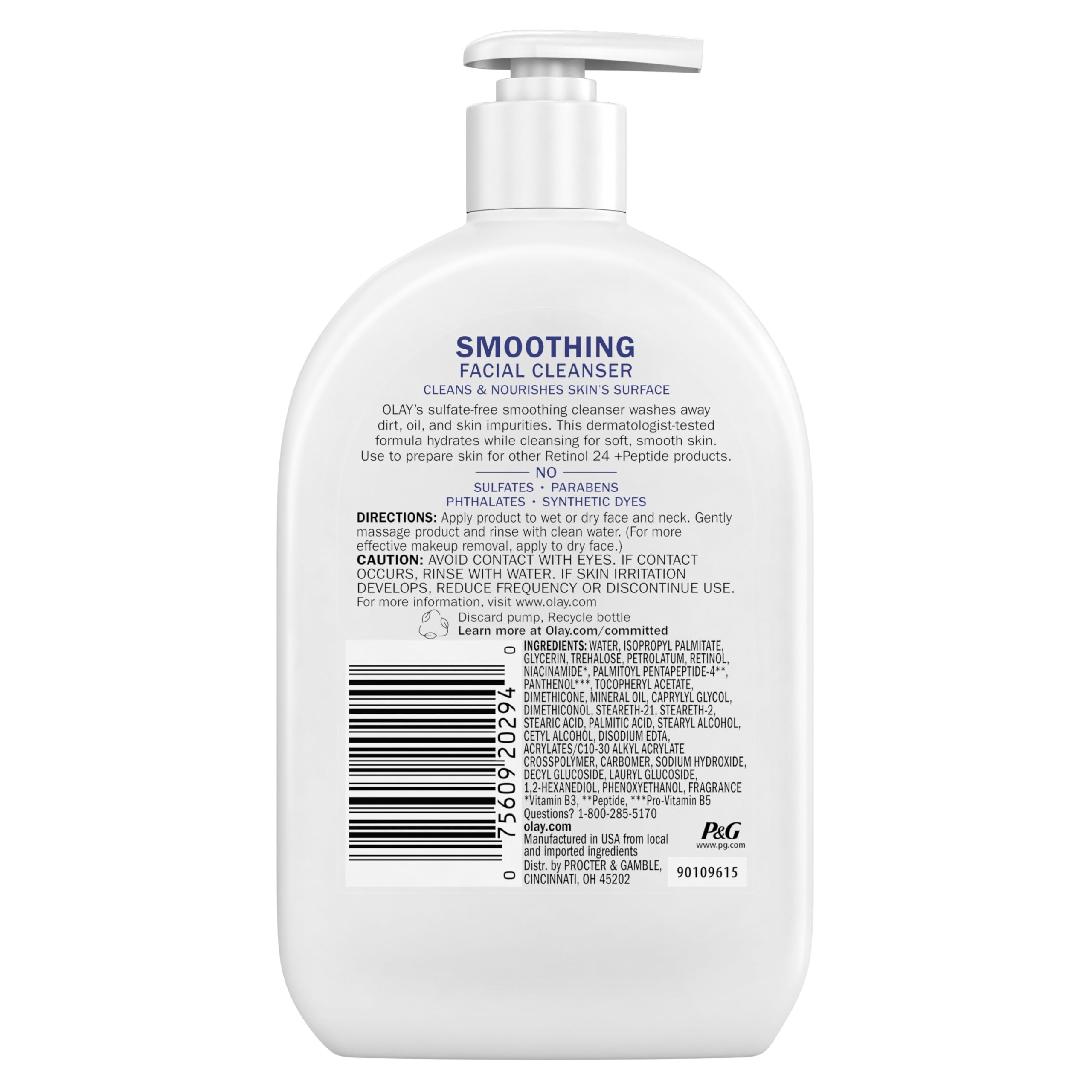 Cleanse your way to fresh and prepped skin. OLAY Smoothing Daily Facial Cleanser with Retinol 24 + Peptide delivers sulfate-free cleansing that hydrates to nourish the surface of your skin with every wash. This lightly scented cream cleanser hydrates while cleansing to remove dirt, oil, and impurities for soft, smooth skin. Formulated with Retinol, Niacinamide (Vitamin B3) and Peptides this face wash is gentle enough for daily use. Just wet face with water, gently massage the cream cleanser over your face and neck, then rinse with clean water. Follow with your favorite OLAY treatments and moisturizers. After your first use, you will instantly experience clean skin, perfectly prepared for the rest of your skincare routine. Within 1 week of use, you'll reveal soft, smooth skin. Within 1 month, when used with Olay moisturizers, you'll experience a noticeable skin transformation. This dermatologist-tested formula is made without sulfates, parabens, phthalates, and synthetic dyes. Because nothing looks and feels fresher than smooth, soft, nourished skin.At Olay, we're serious about our commitments. Our Olay Skin Promise to you is zero skin retouching in all advertising. Olay is the first mass skin care brand in the US to take this stance, because we know real beauty is honestly beautiful. We also guarantee you'll love your Olay product. If you are not satisfied, we'll give you your money back via a prepaid card. Must submit within 60 days of purchase. Call toll-free 1-855-845-9797 or visit olay.com/guarantee.