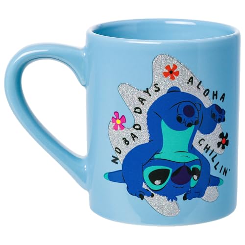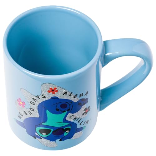 SIZE AND MATERIAL: Holds 14 ounces and made from durable ceramic with shimmering glitter detail. Features Stitch lounging in paradise with "No Bad Days" text in bold tropical tones.