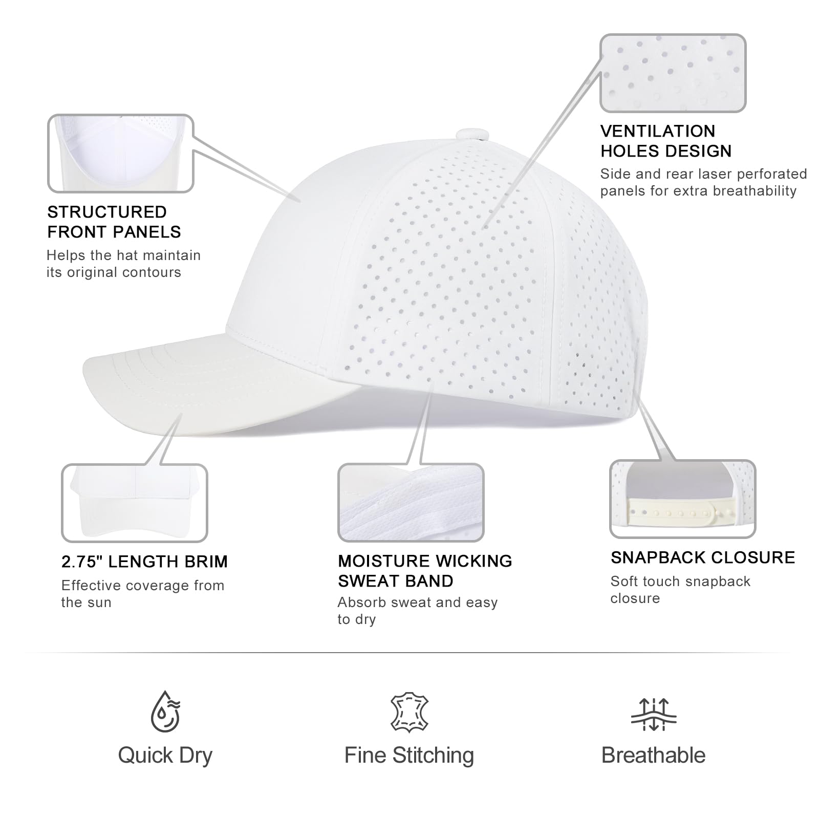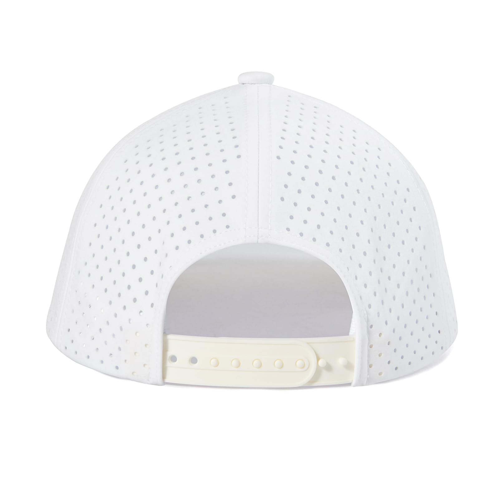 Design: structured front panels, 6-panel cap, curved brim, laser-perforated side & rear panels for breathability, and soft touch snapback closure