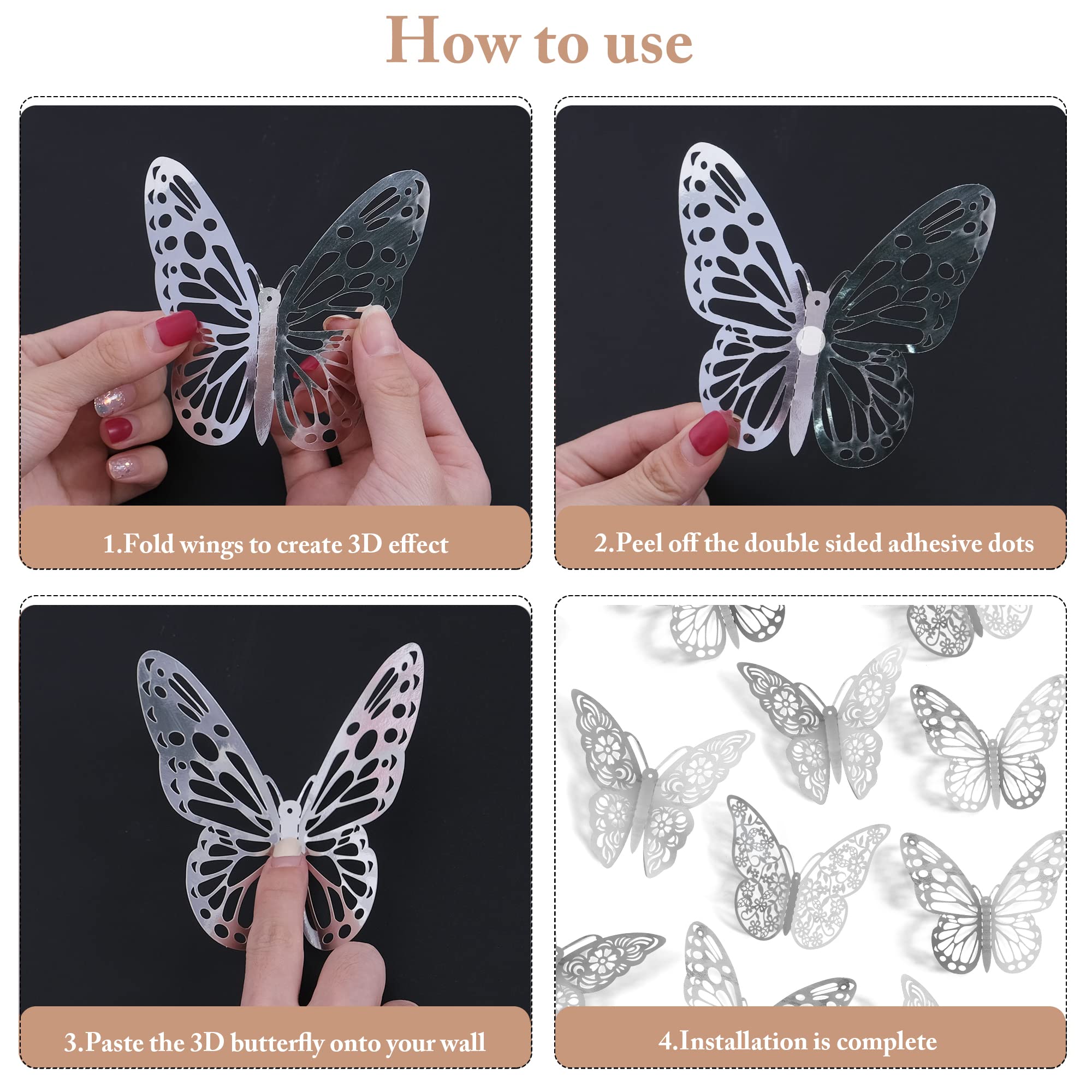 【Package Included】72pcs butterfly wall stickers: 24 pcs Style 1, 24 pcs Style 2, 24 pcs Style 3, each style has 3 sizes(3", 4", 5") and each size has 4pcs. Coming with 72pcs double sided adhesive dots.