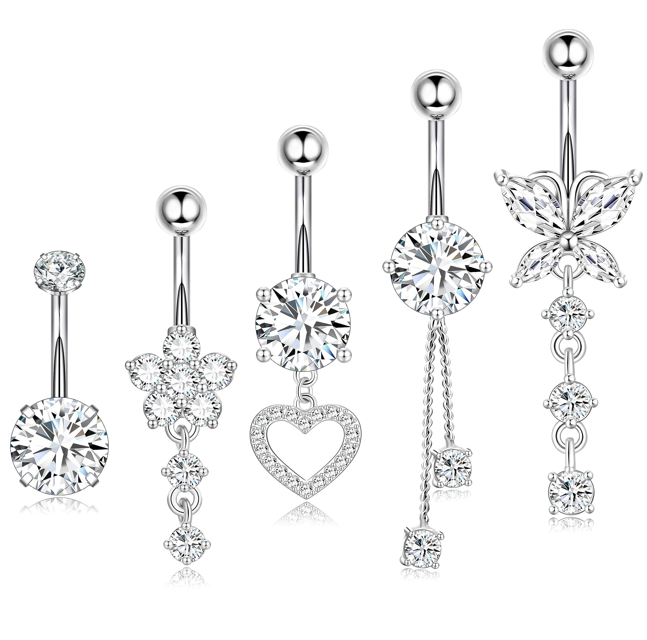 【BELLY RING】: One order includes 8pcs belly button rings: 4pcs short belly piercing and 4pcs long dangle belly button rings, flower, butterfly, heart belly button rings set, multiple style to match your outfit.