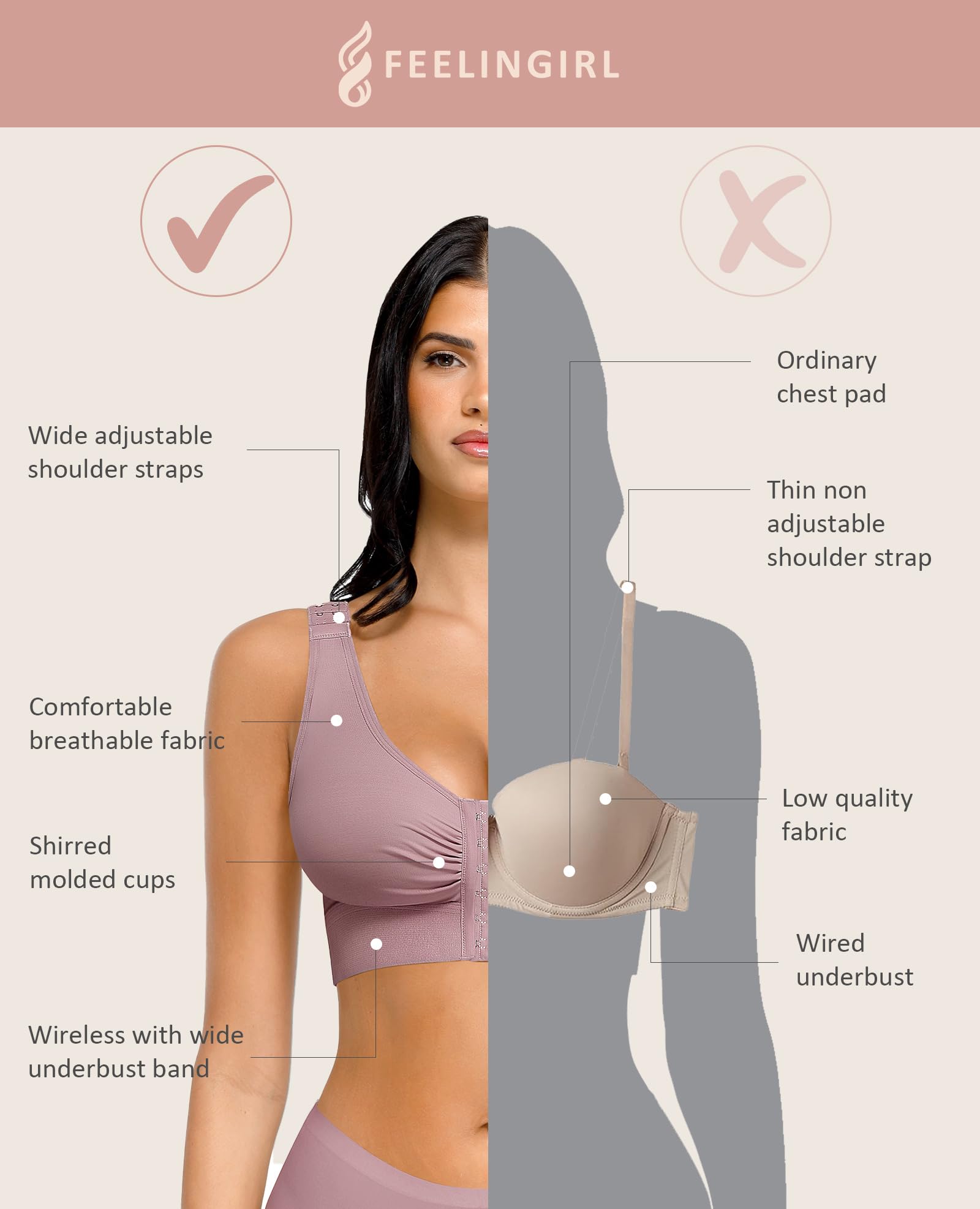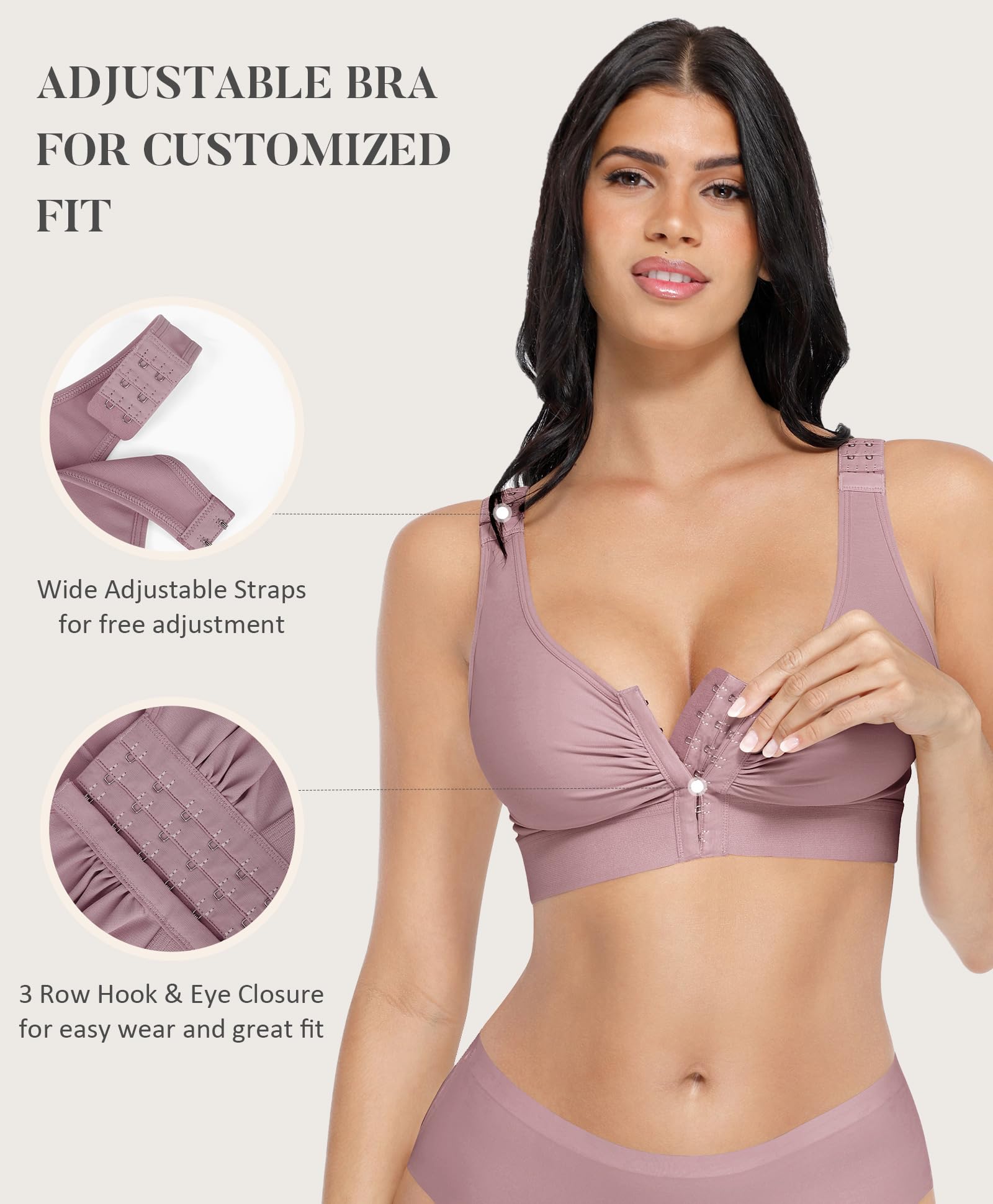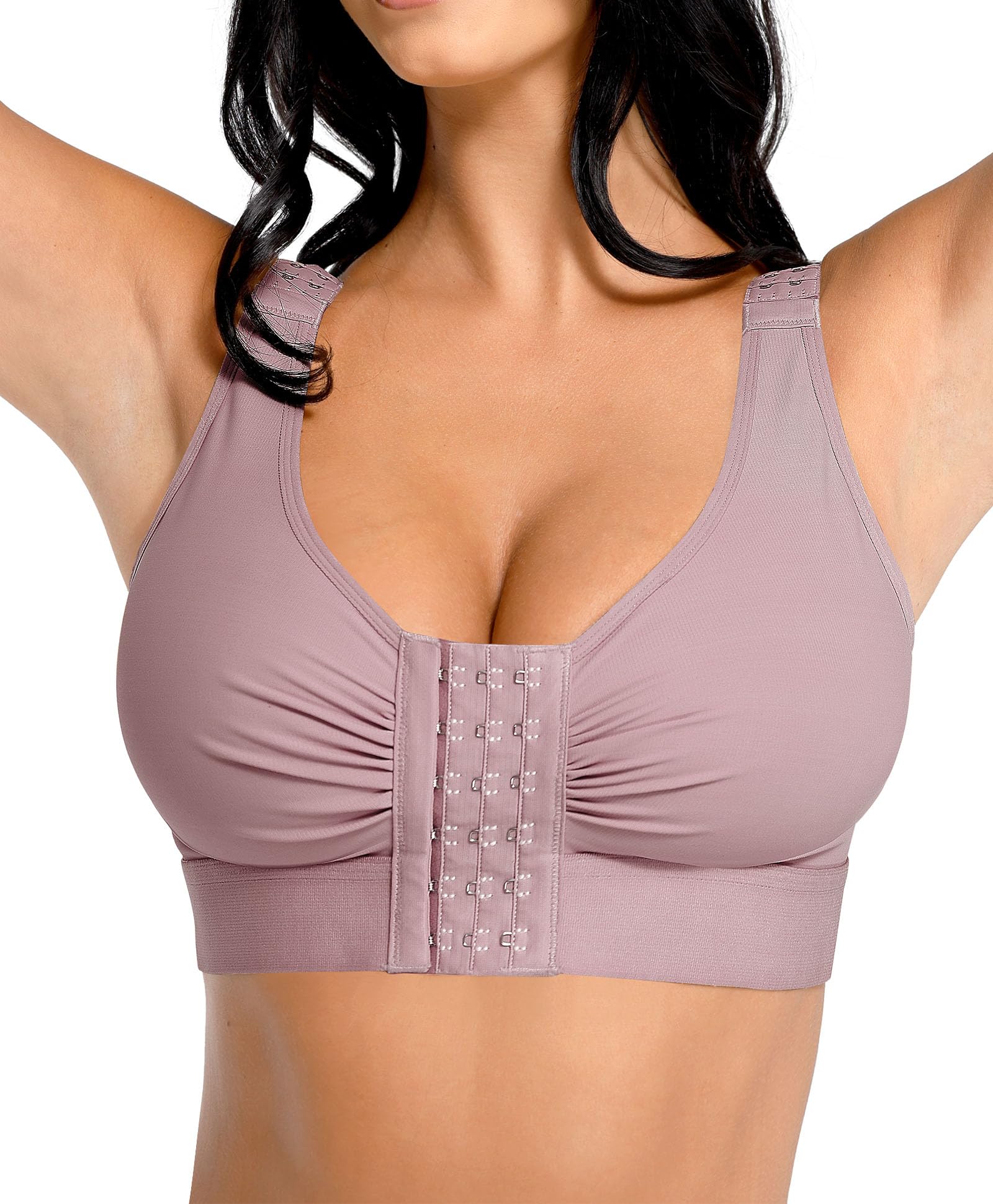 EASY ADJUSTMENT: This women's front closure bra can be adjusted in multiple ways to accommodate various cup sizes, including three rows of hook-and-eye closures in the front and shoulder closures for full adjustability. It is easy to wear, and you can adjust the compression level as needed at any time.